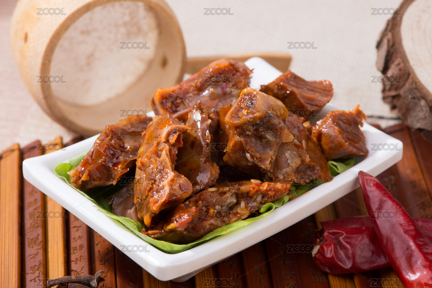 木纹背景上餐具中摆放的黑鸭鸭脖