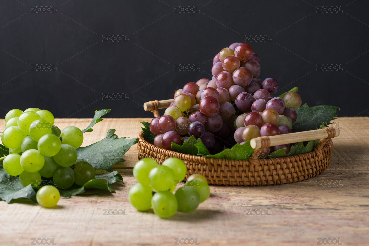 暗色背景下在木板上摆放的多个葡萄串带绿叶