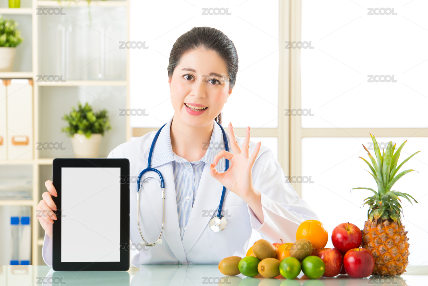 医生营养师水果持有数字平板电脑和好的符号,健康饮食