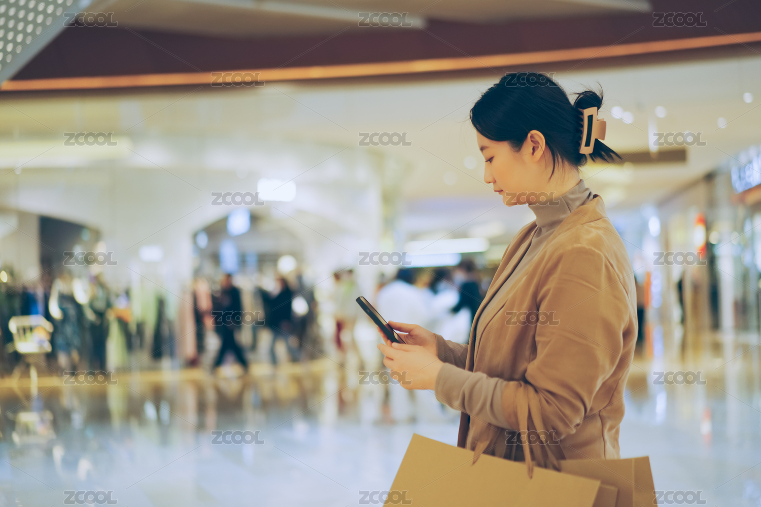 从平台站在站厅,手持智能手机寻找一个未来的征程上的年轻女子游出境。