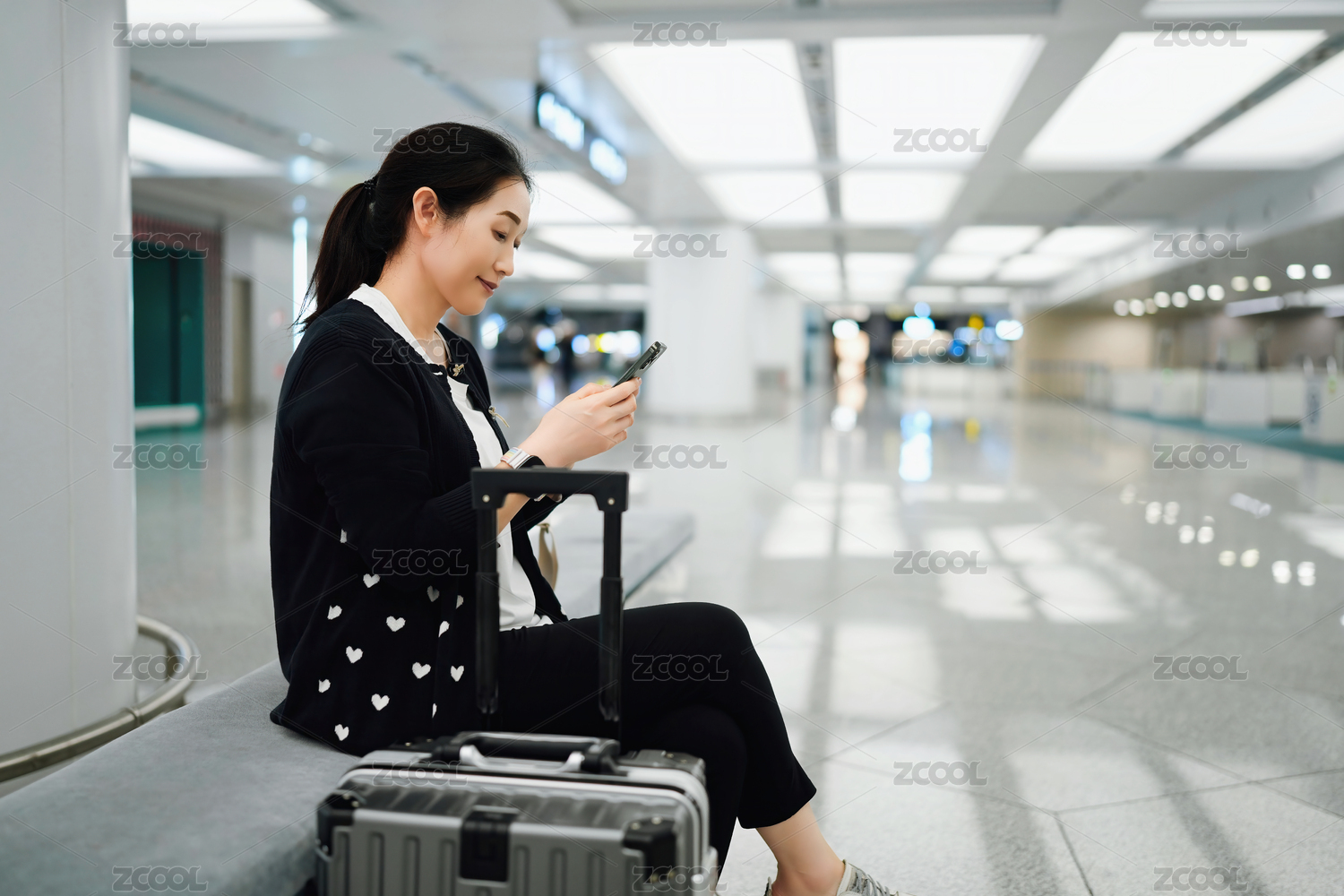 现代旅行者在繁忙的机场航站楼使用智能手机