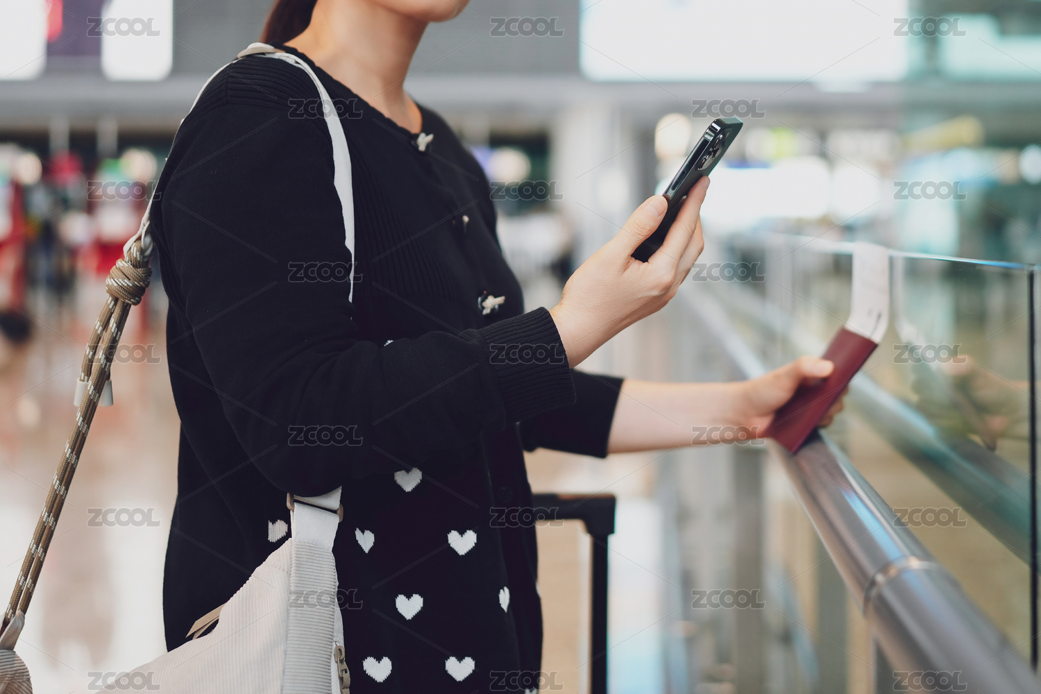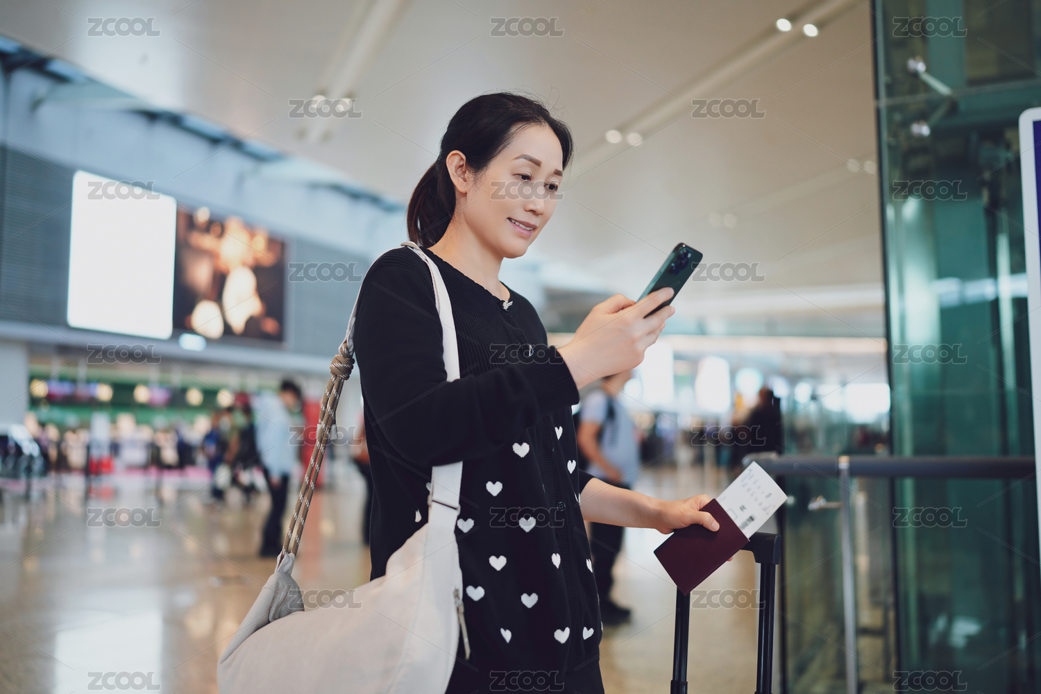 使用智能手机在台湾机场美丽的旅游女人。年轻的亚洲旅客登机检查的时间与在终端或火车站移动电话应用。旅游度假的概念。