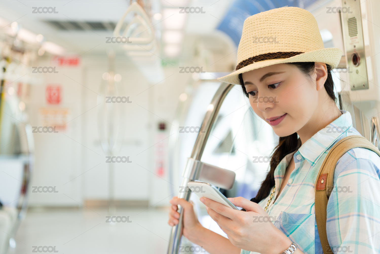年轻漂亮的女子背包旅行用智能手机站立在洁亮台北捷运地铁车。城市旅游的概念。