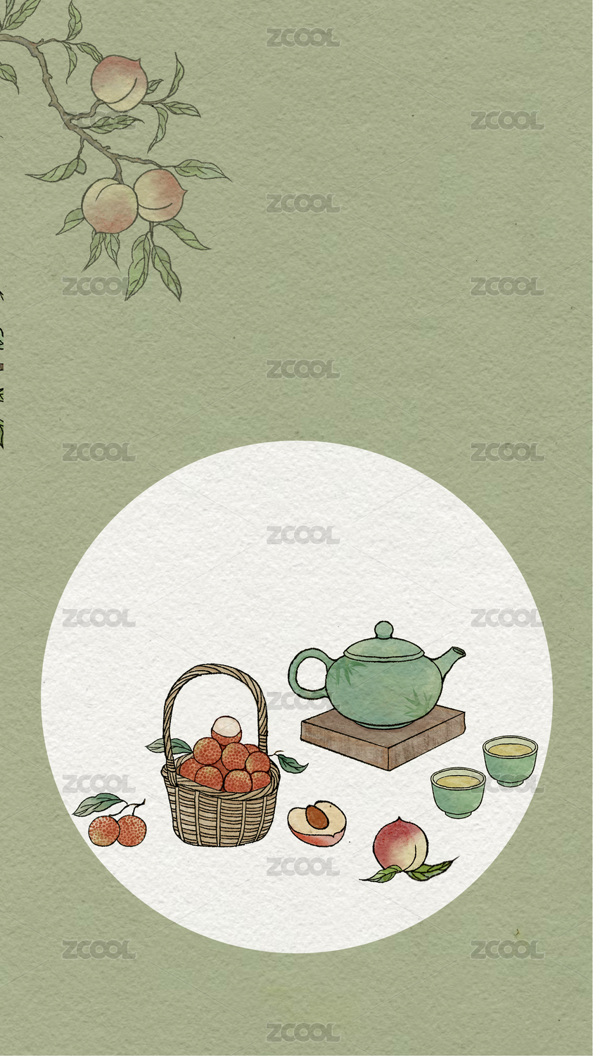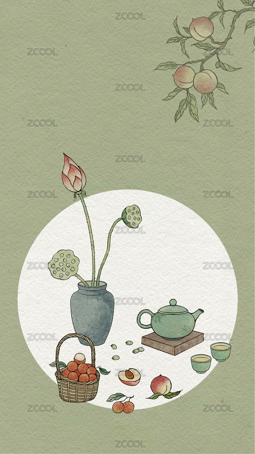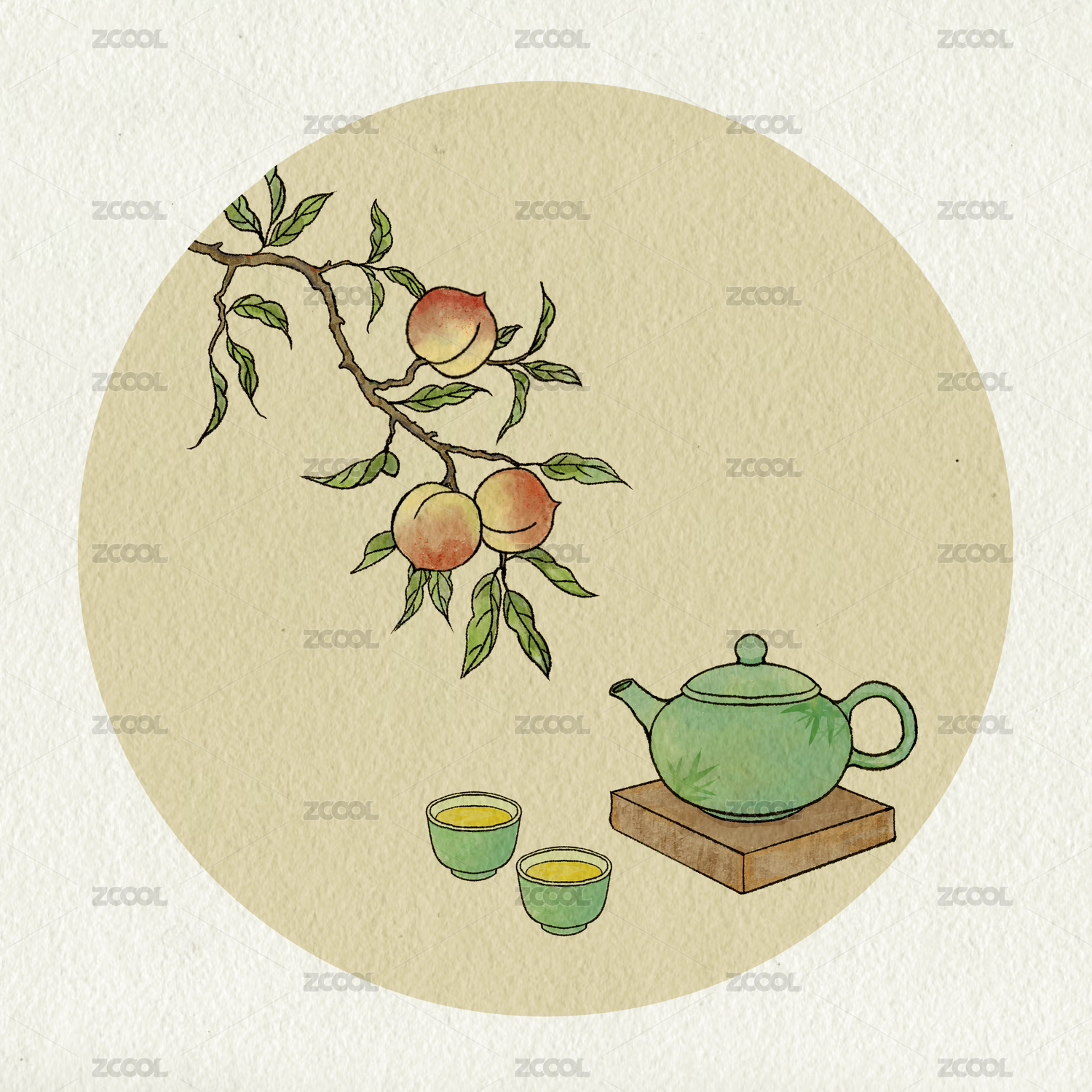 荔枝桃子茶壶莲蓬中国风水墨插画