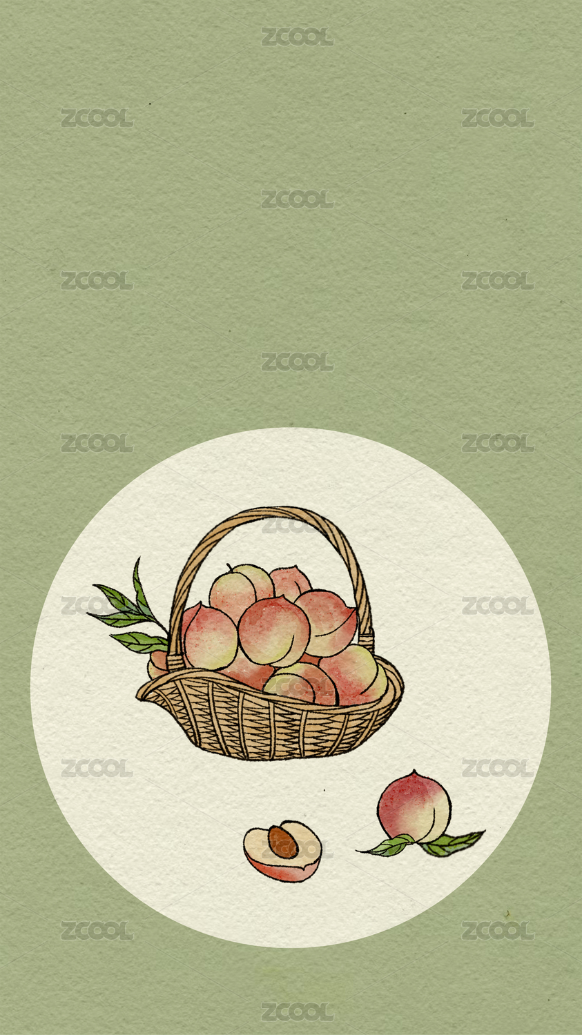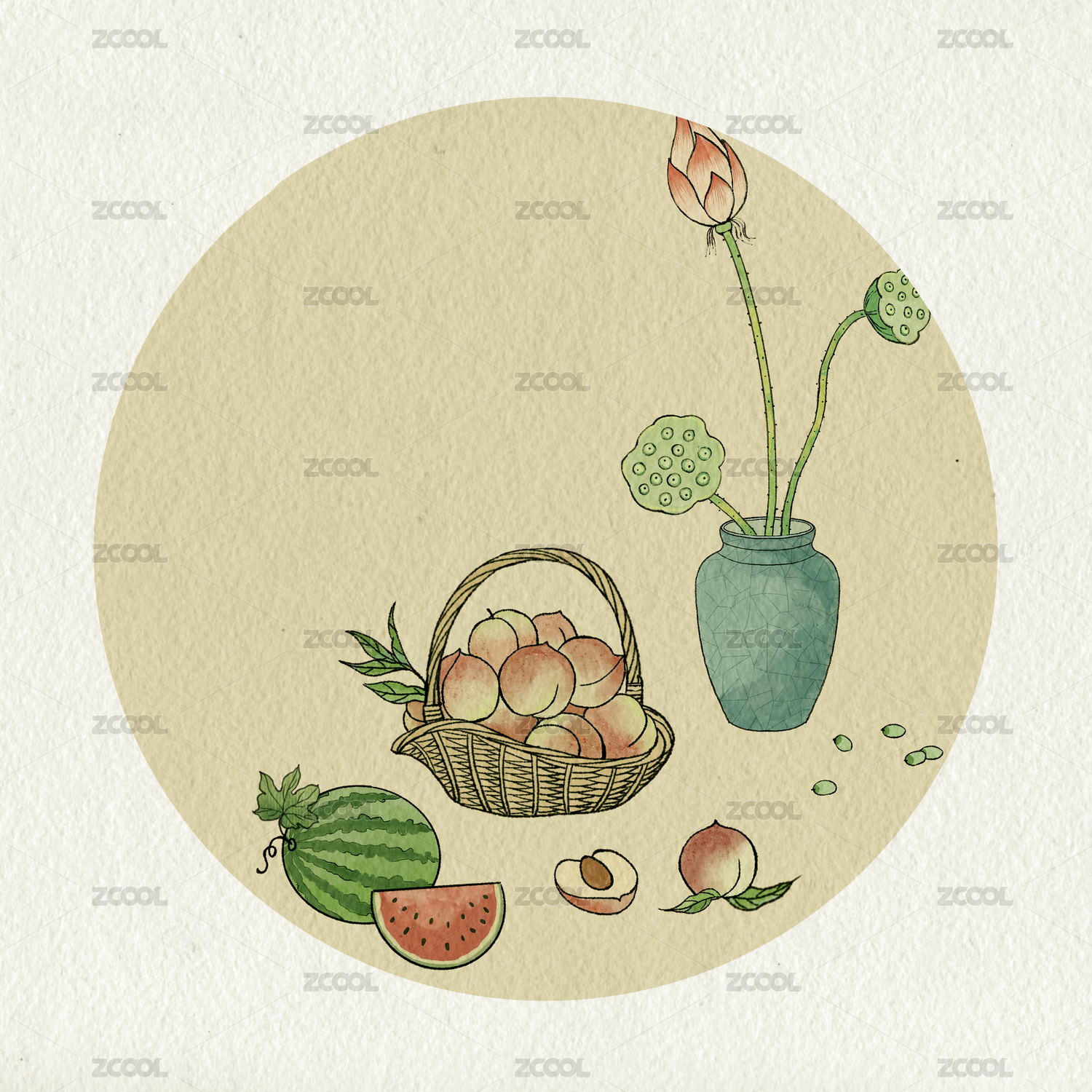 夏天节气时令水果桃子西瓜莲蓬水墨插画