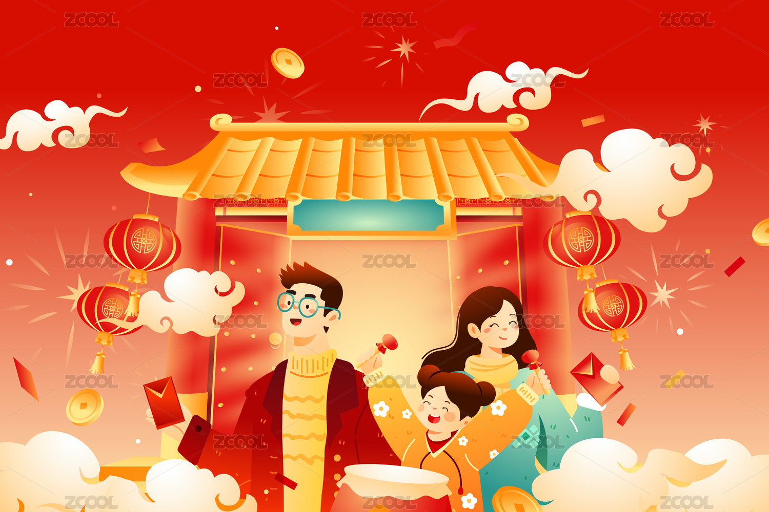 卡通2020新年春节看春晚合家欢中国风背景矢量插画