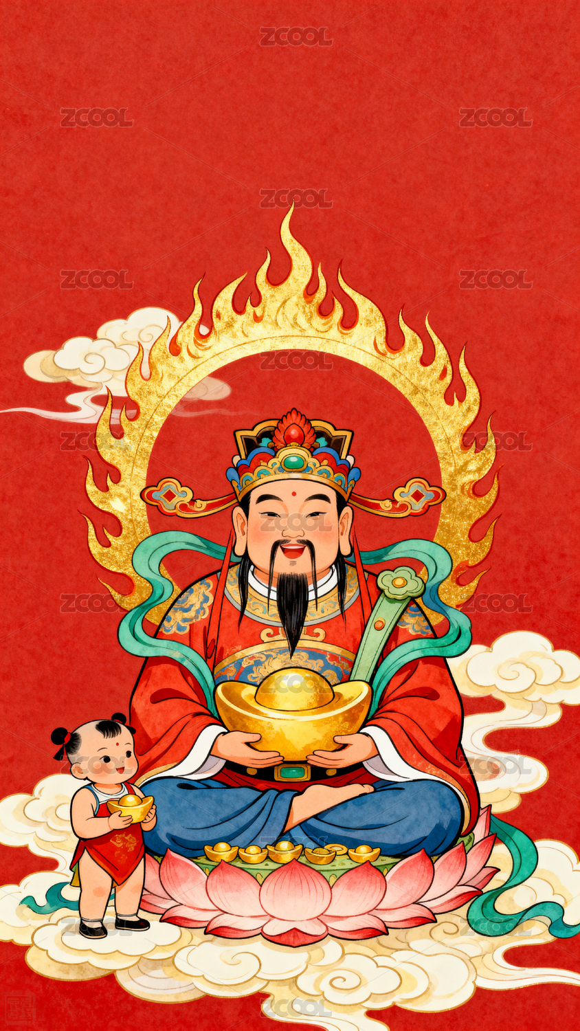 财神爷怀抱孩童寓意吉祥
