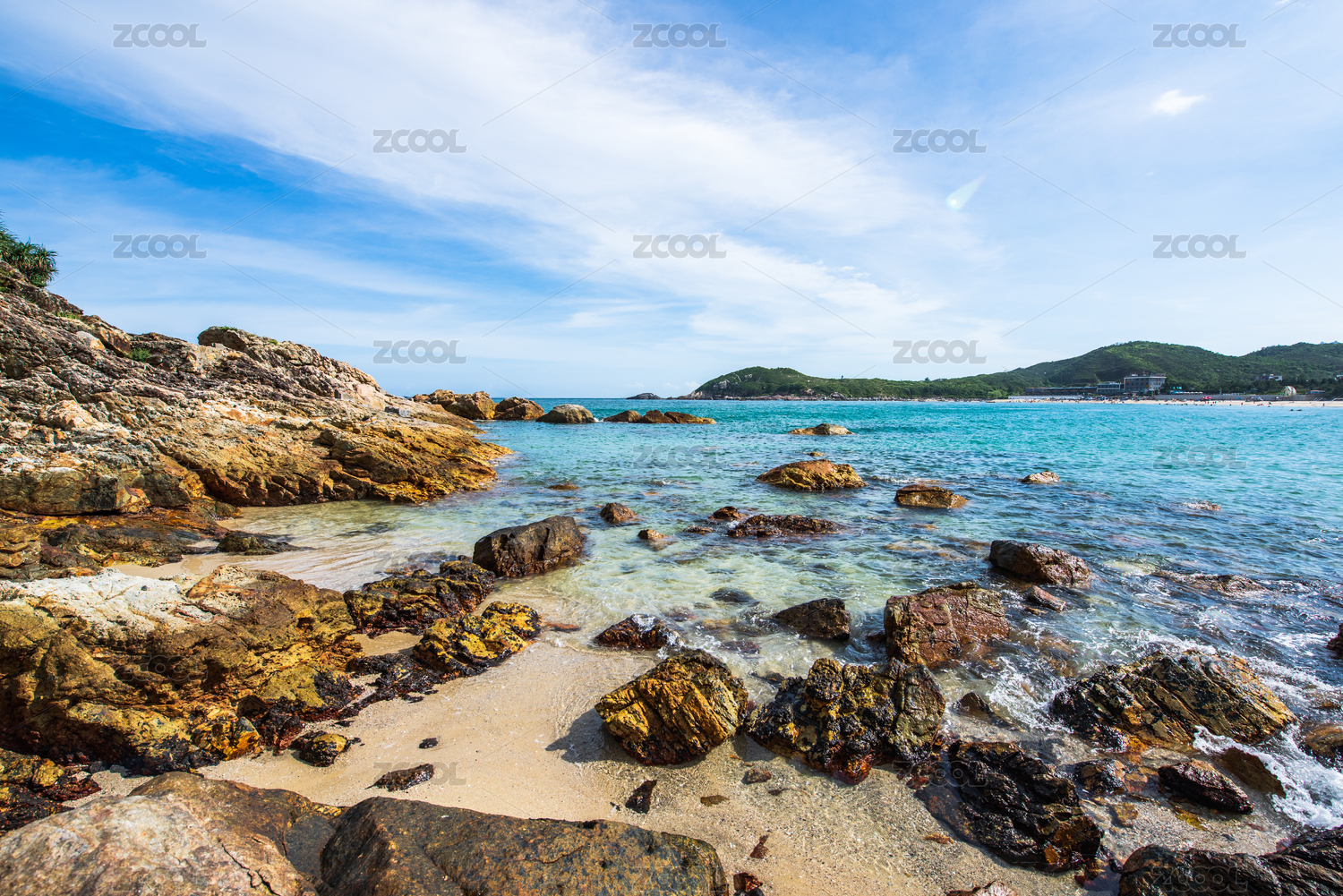 中国深圳东涌海岸蓝天白云下的礁石与大海