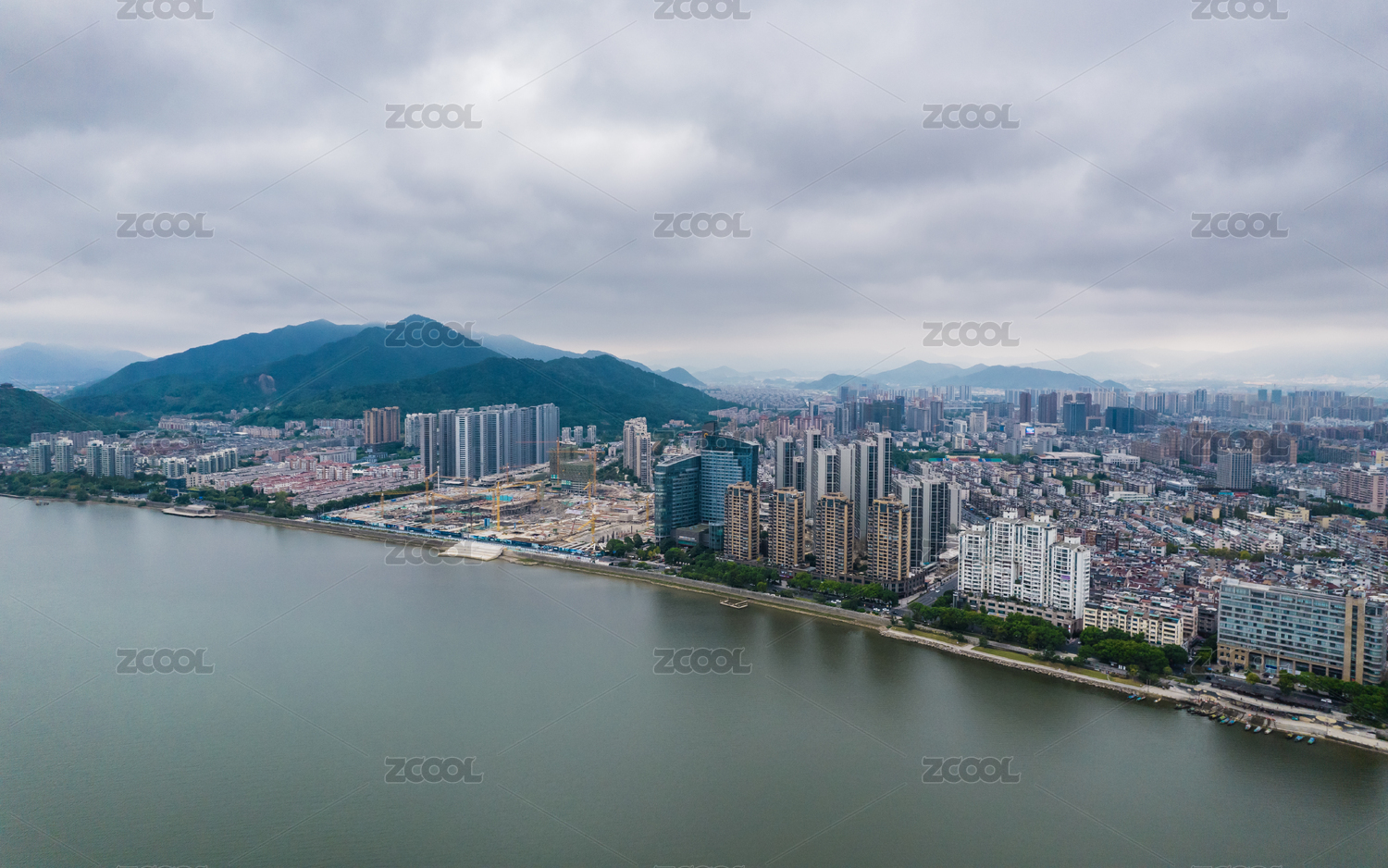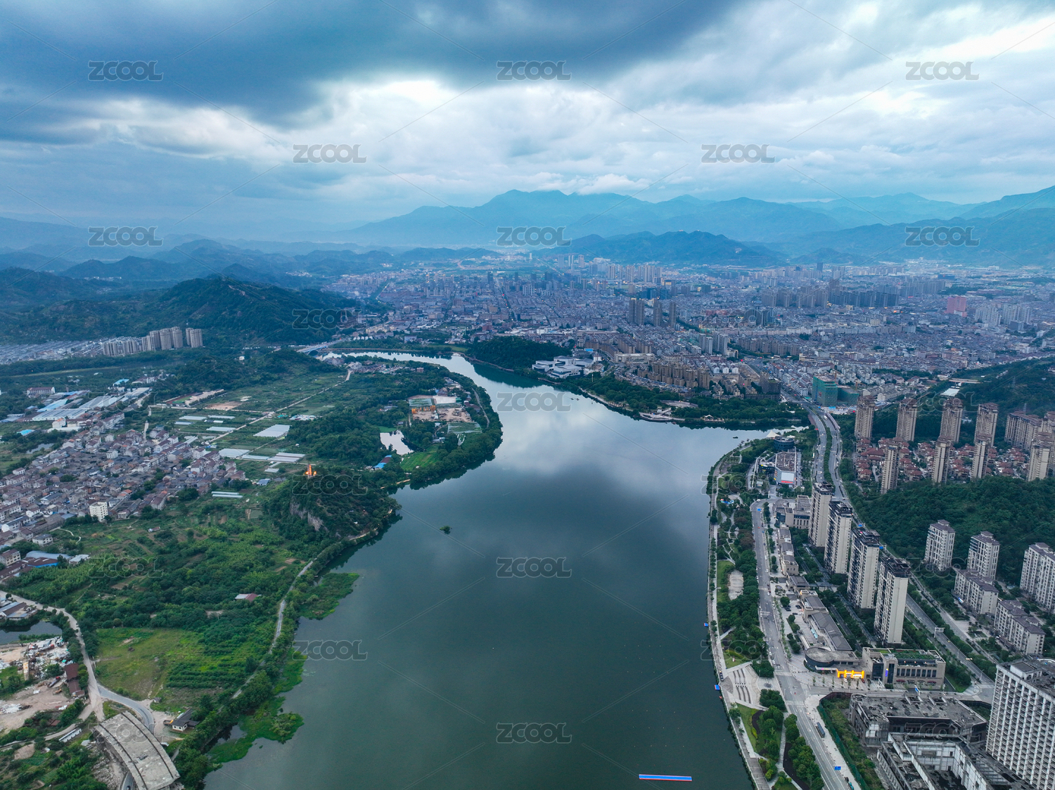 中国浙江杭州富阳区富春江两岸城市风光