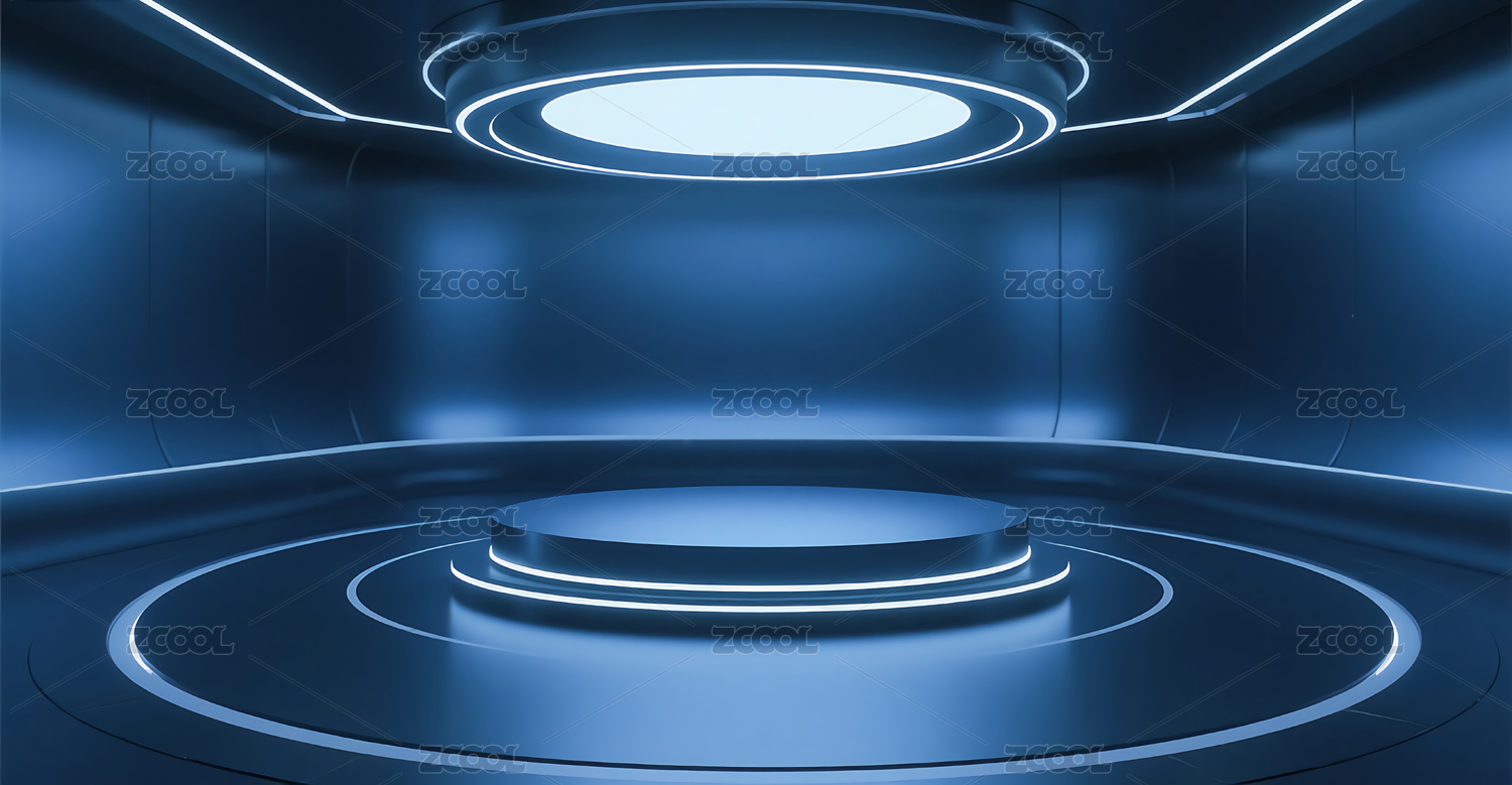 蓝色科幻场景,环形舞台中央,灯光炫目