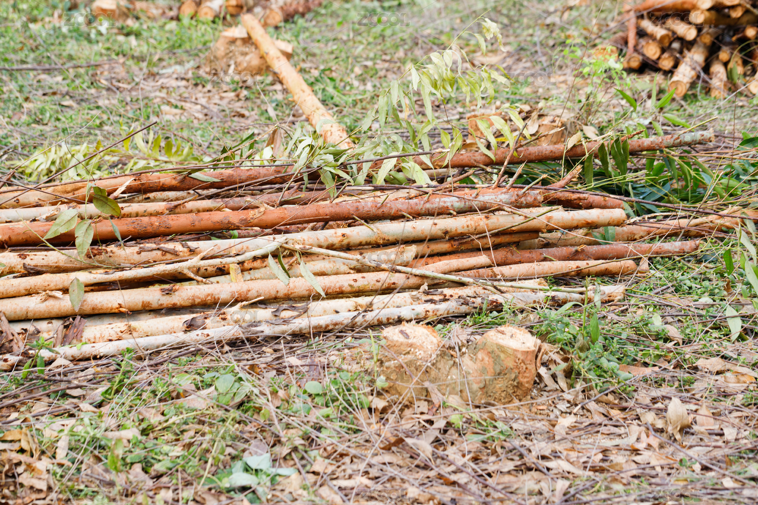 成堆的被砍伐原木树木
