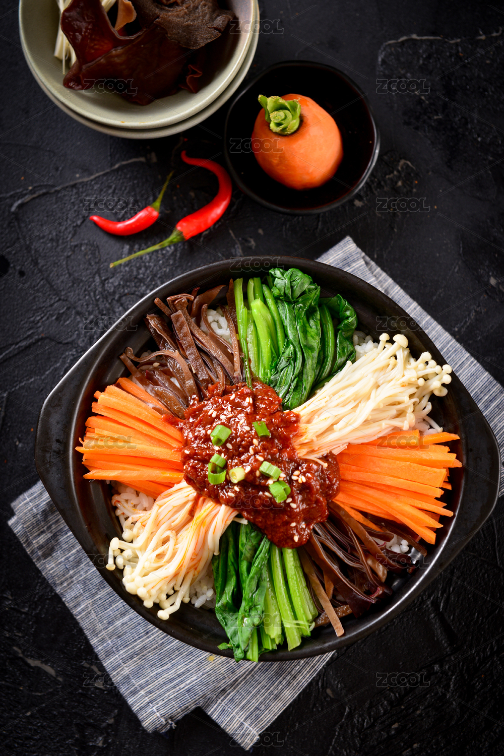 一个黑色石锅拌饭放在黑色岩盘上
