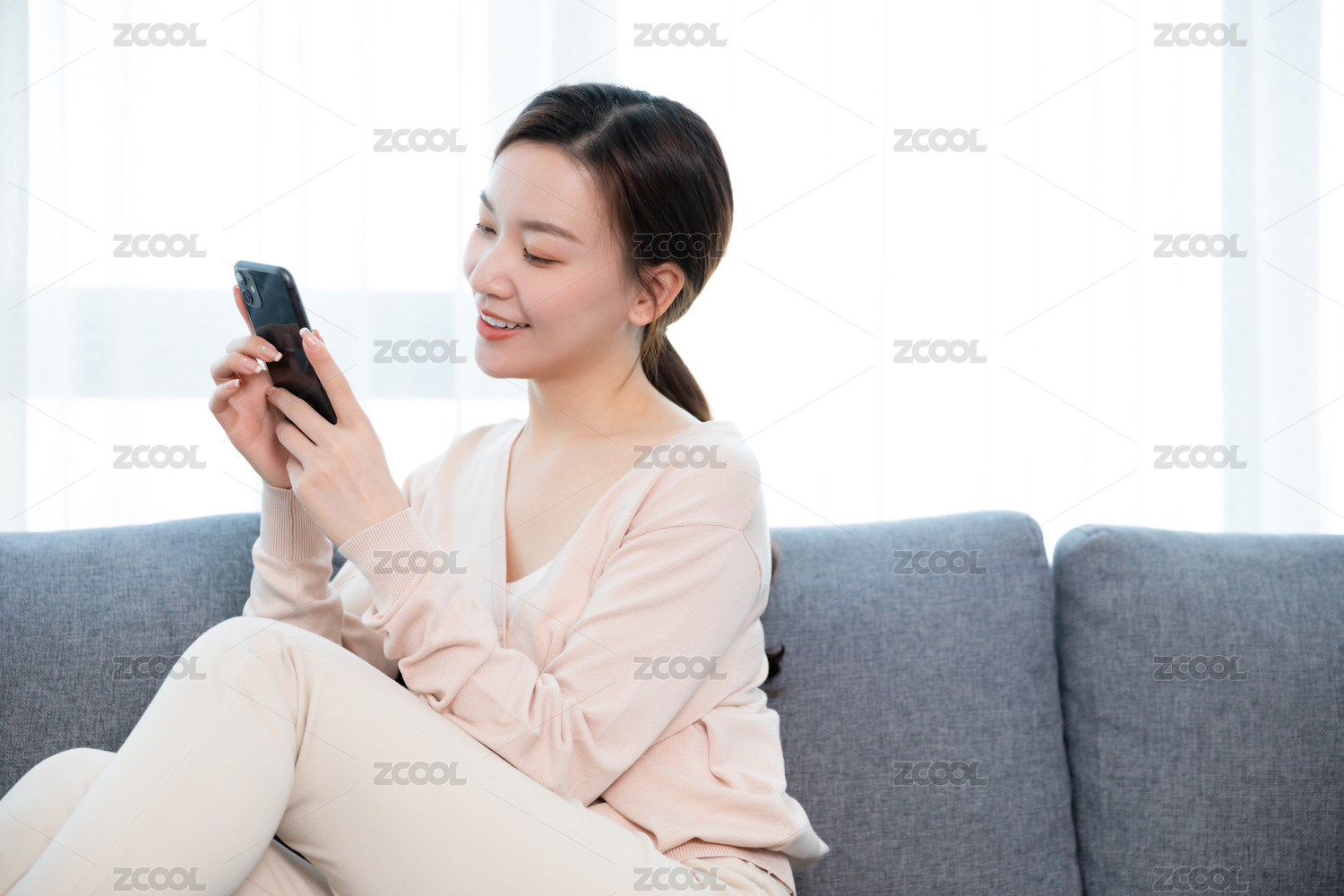 年轻女性在家坐在沙发上玩手机放松