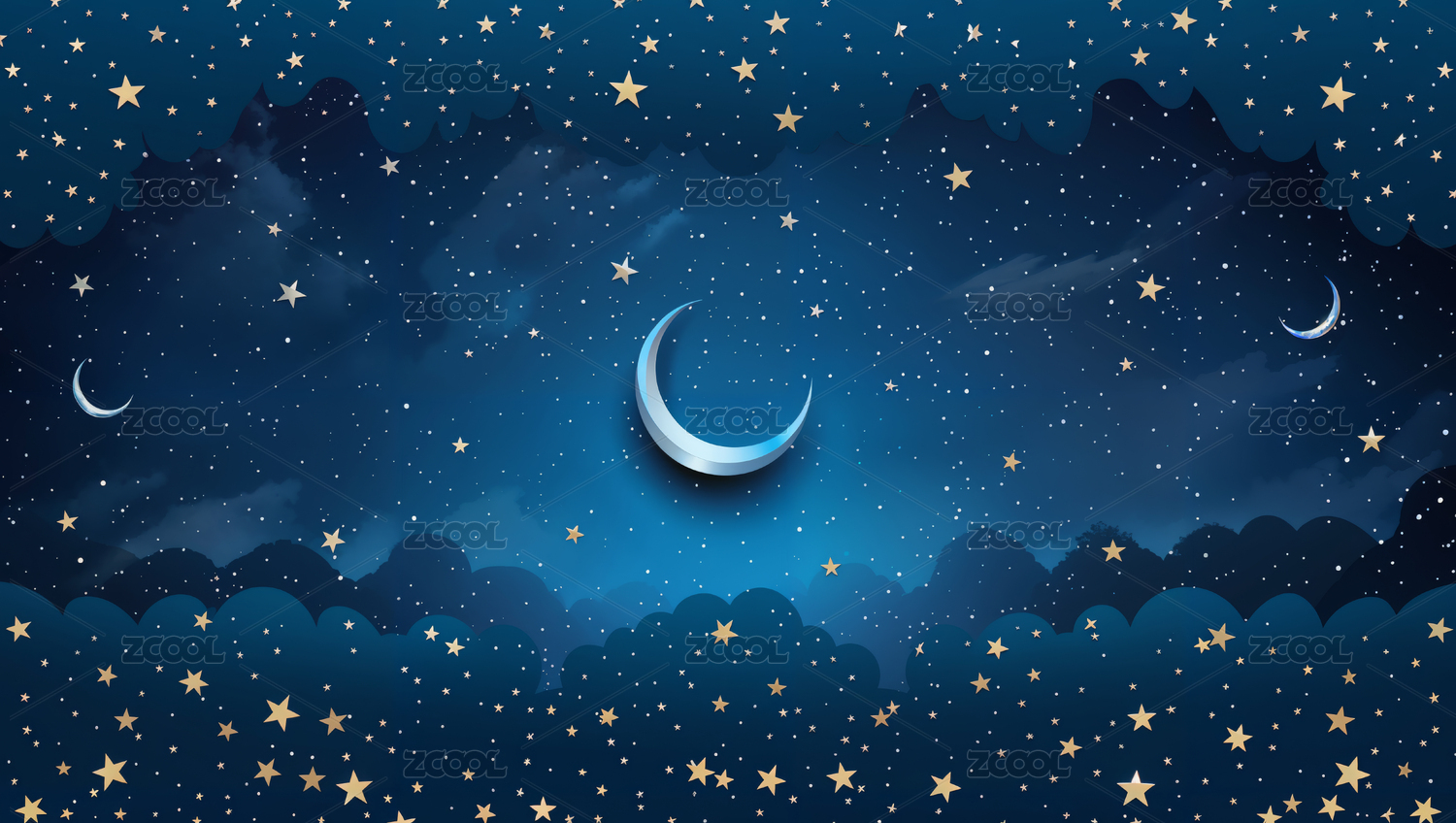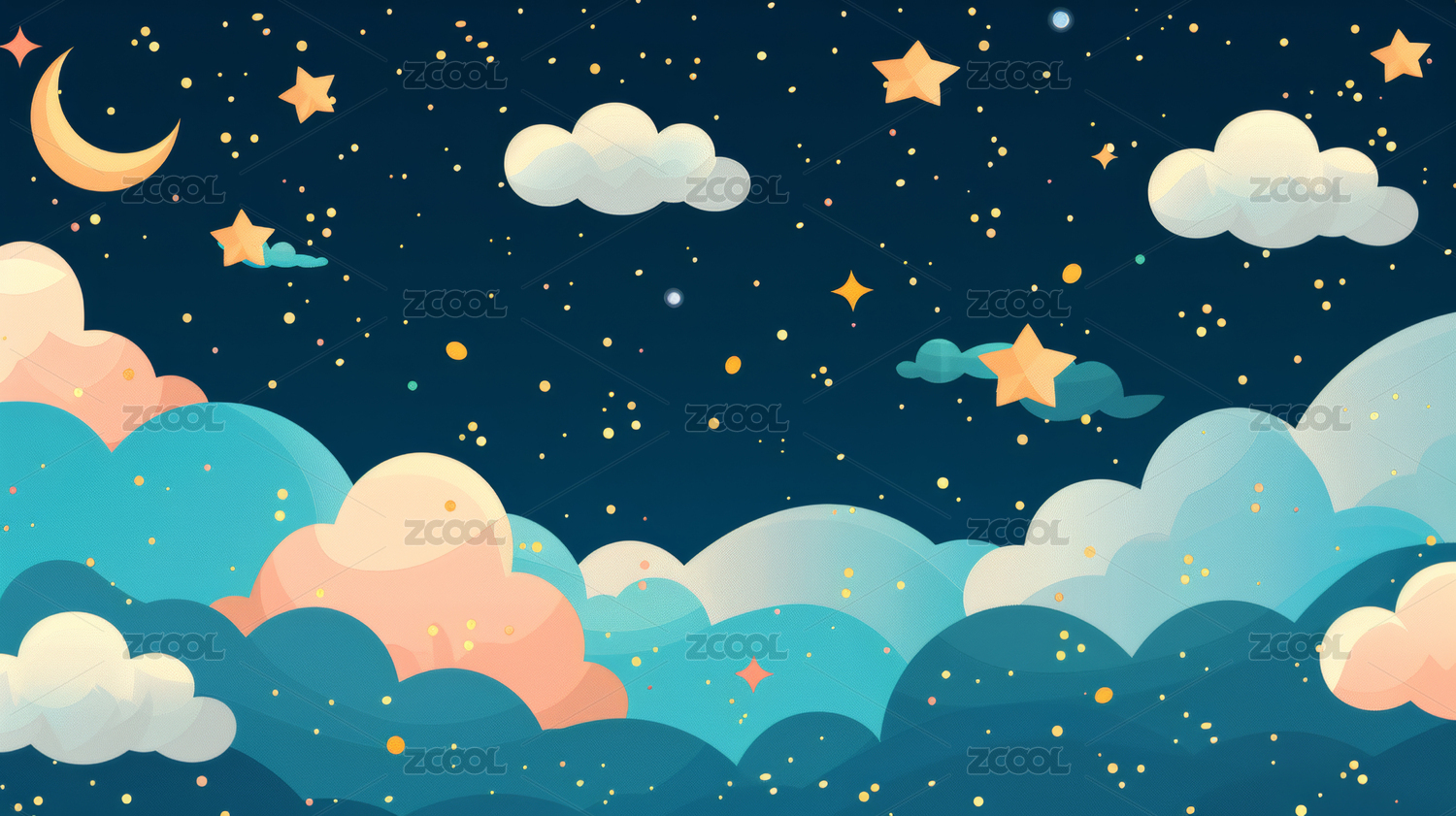 夜空中的星星、月亮和云朵,可爱漫画背景