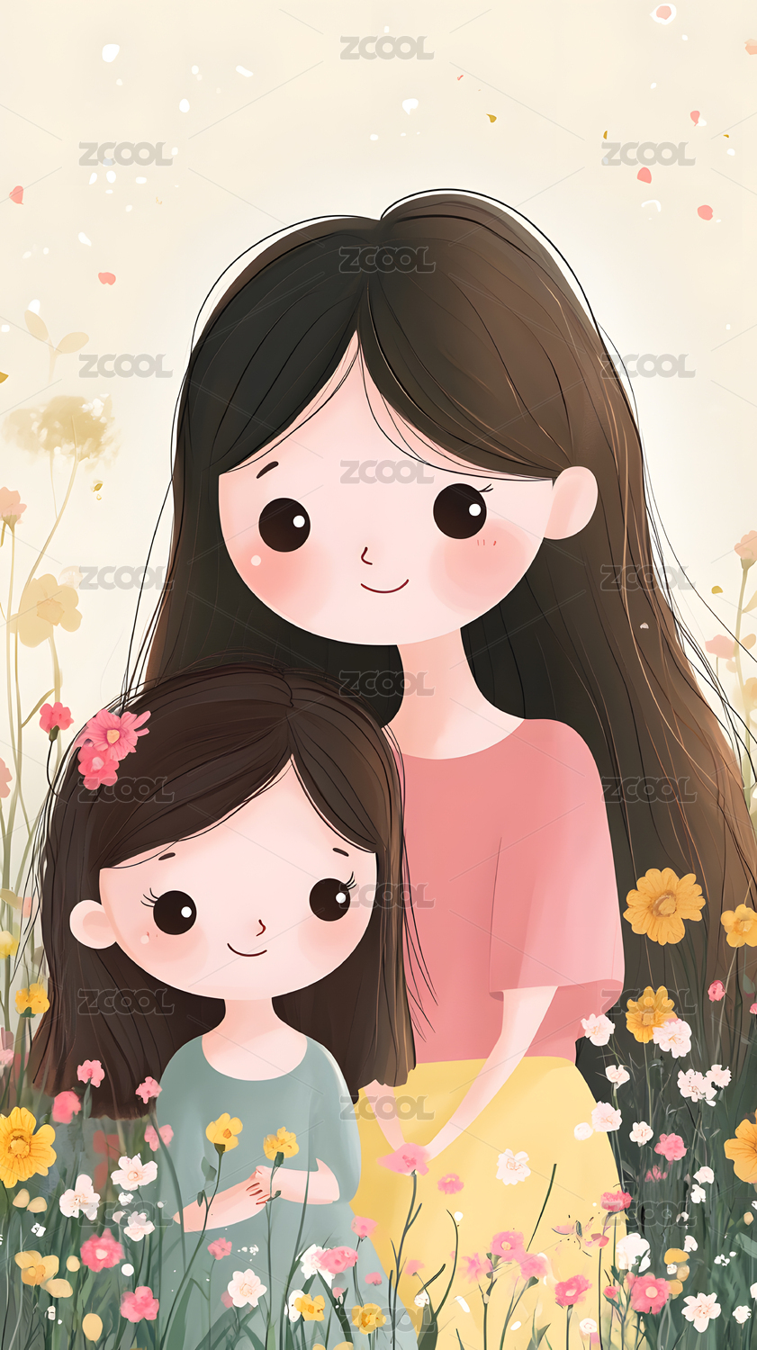 母亲节,母亲,花海,花圈,孩子,花,插画