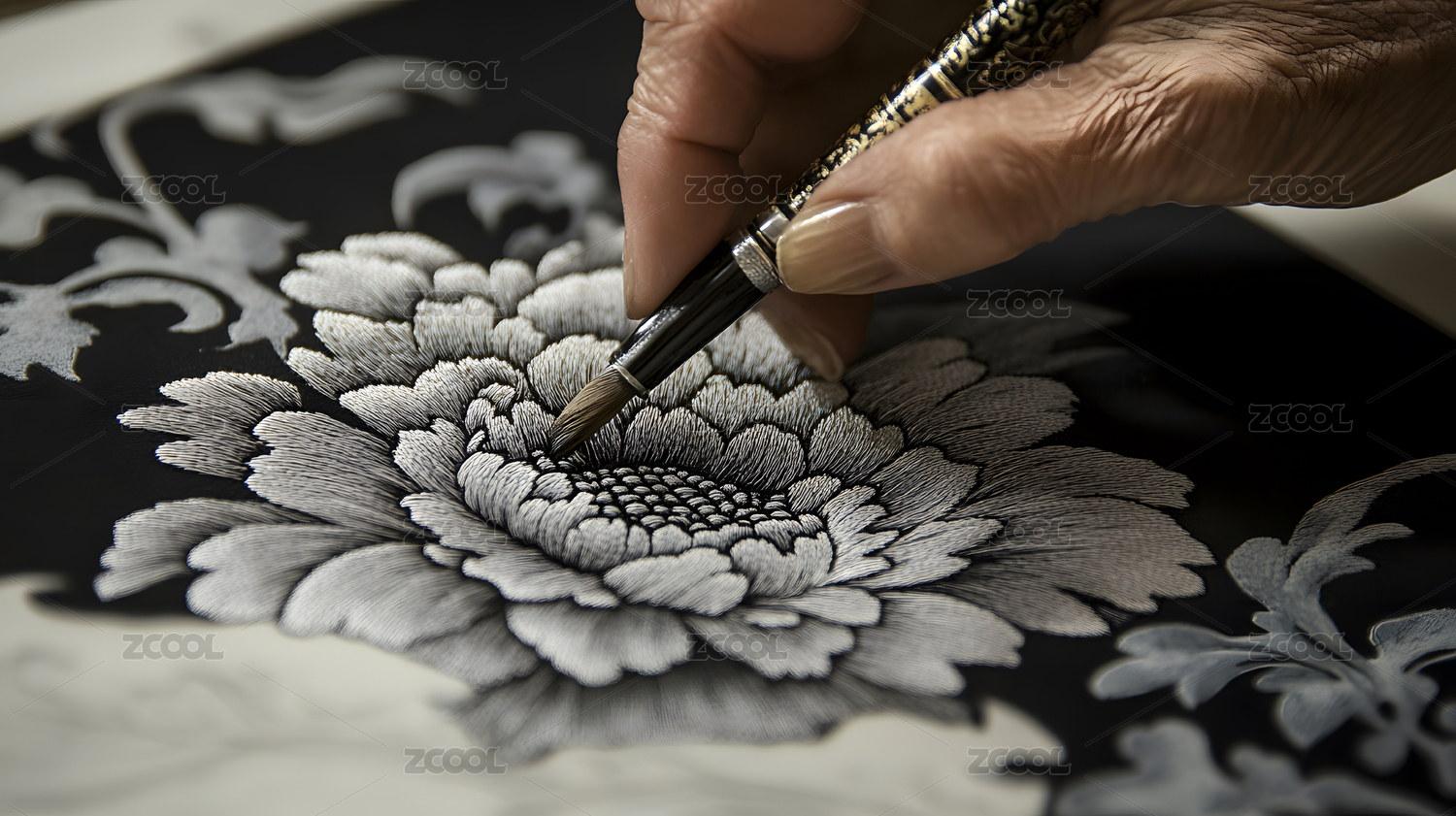 手执笔绘黑白花卉图案