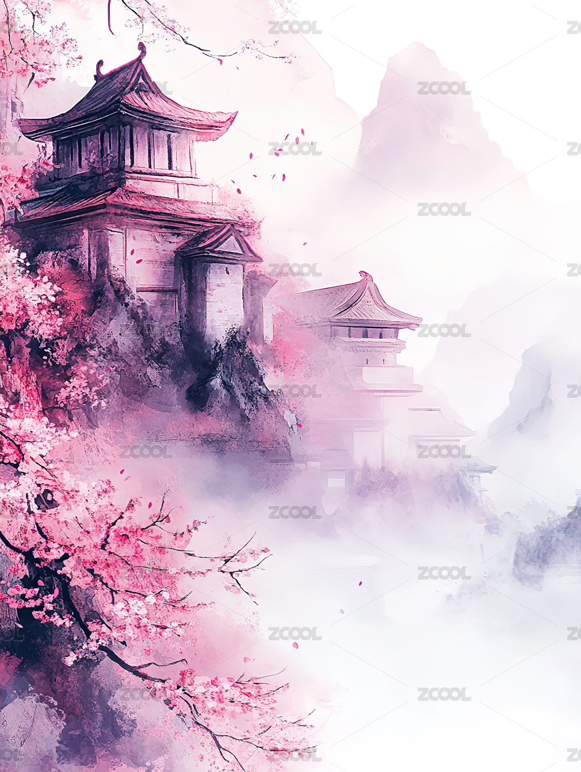 意境,樱花,宁静,祥和,传统文化,水墨画,中国画,写意画,绘画,古建筑