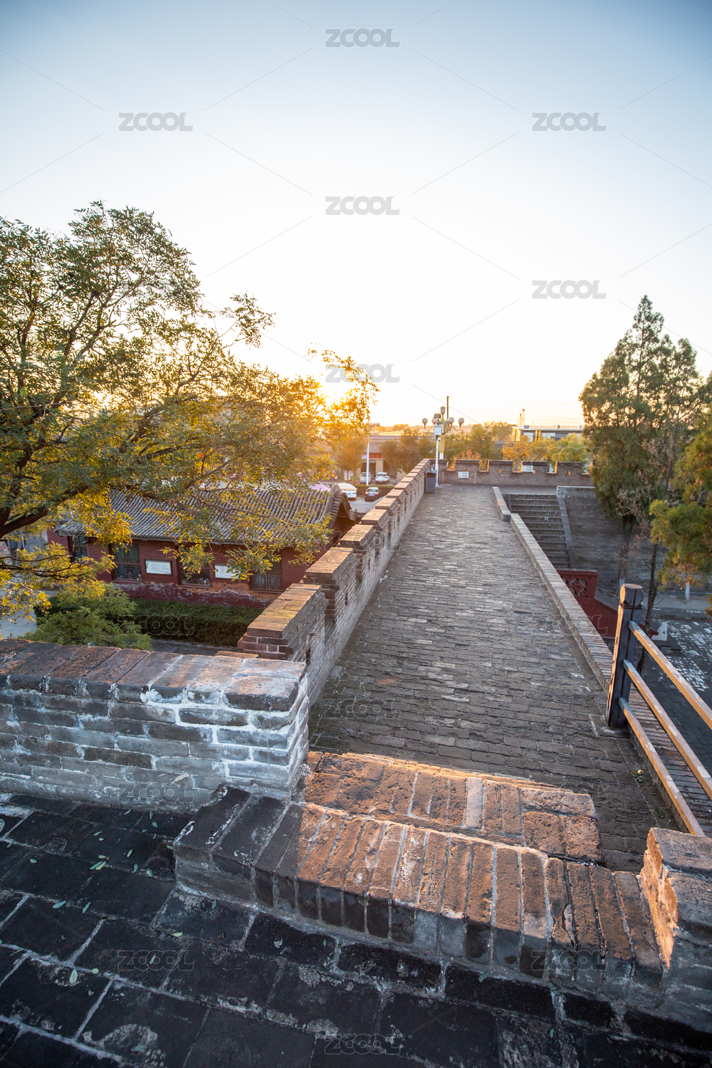 日落下的明代城墙与古代寺庙