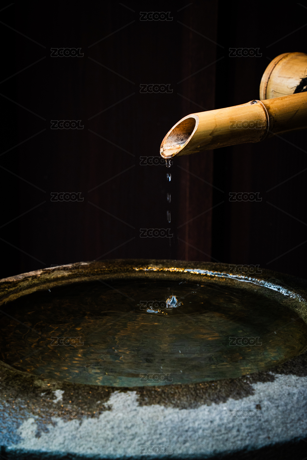 水滴从竹管中滴入传统的日式石盆