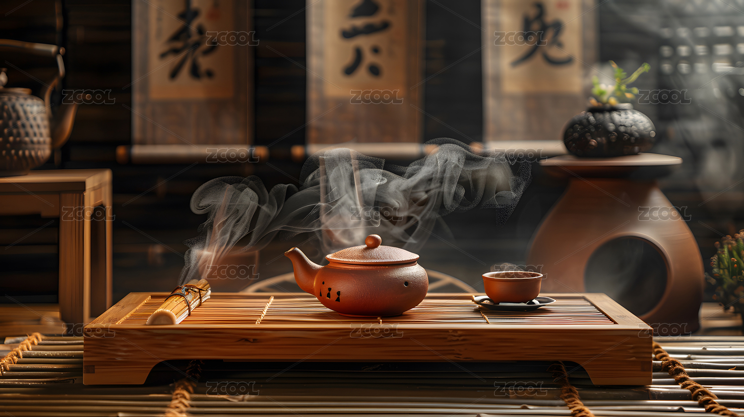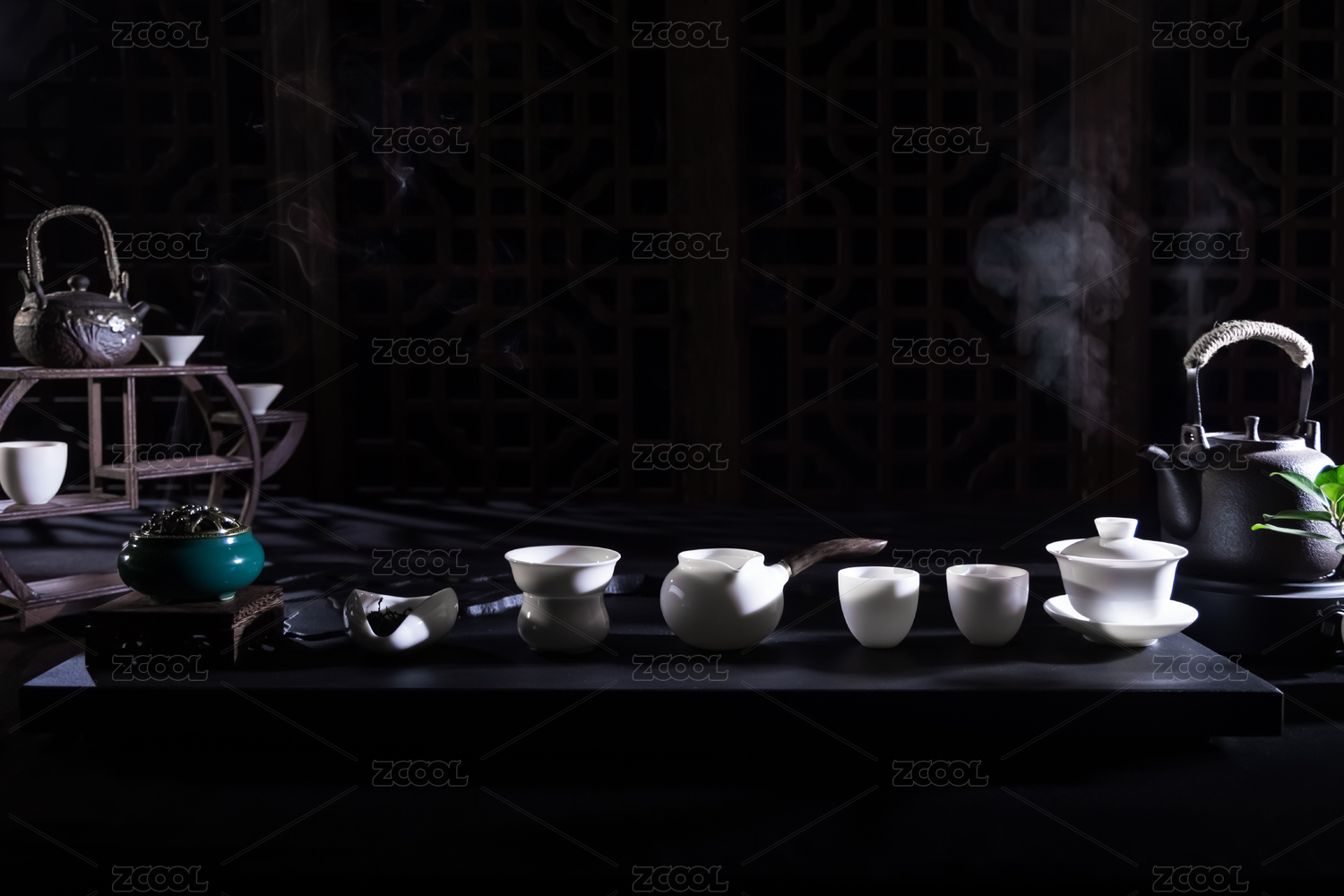 陶瓷茶具和袅袅飘散的沉香烟雾