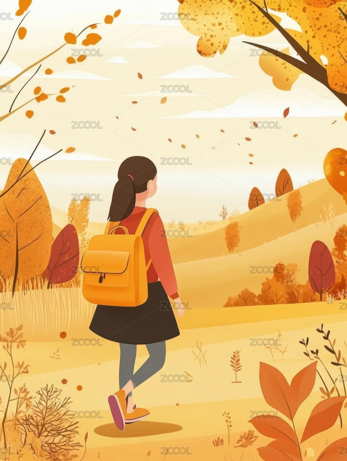 穿着裙子的女孩站在秋天的郊外-矢量插画
