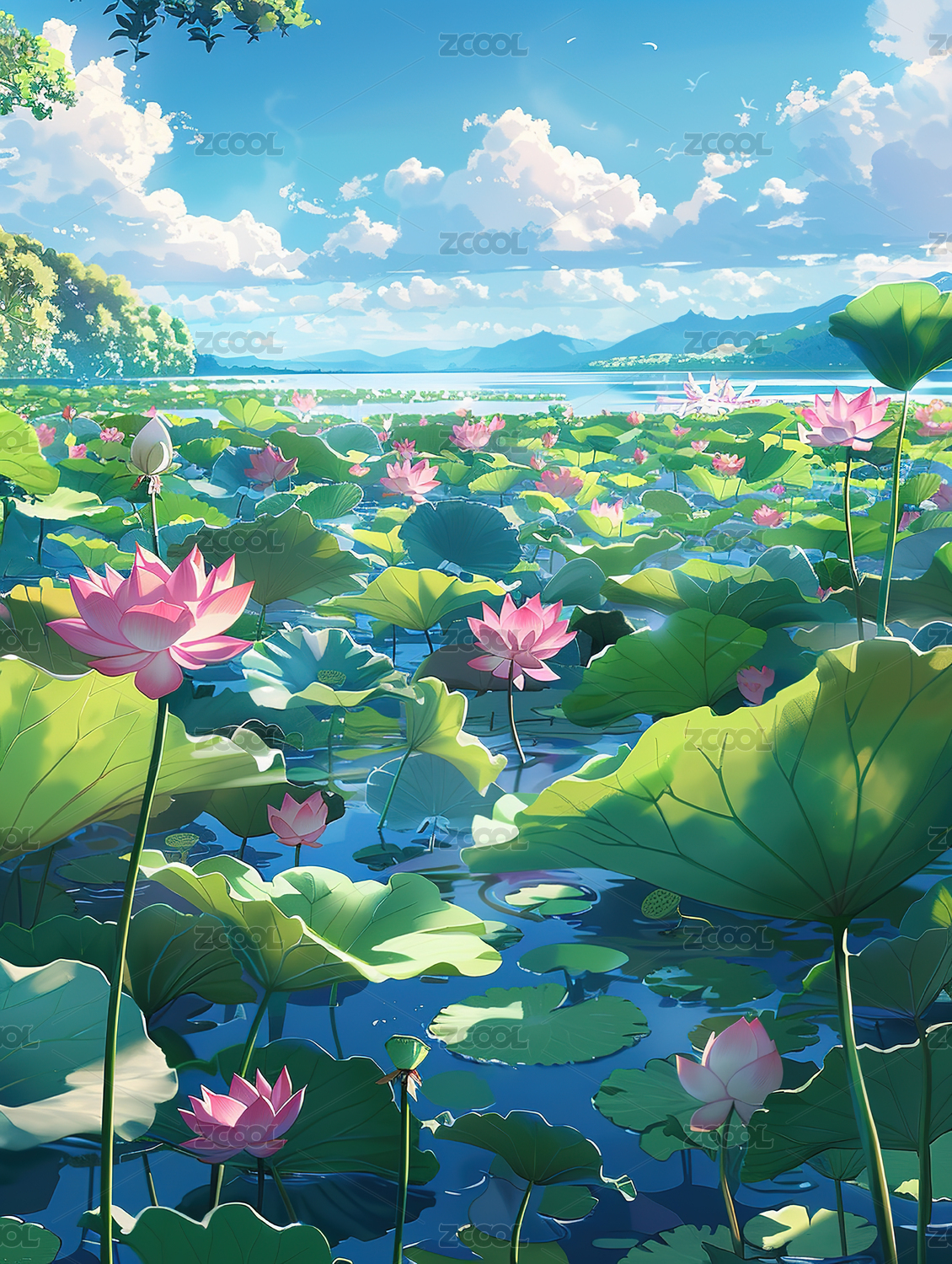 夏天池塘荷花植物绿色建筑清新扁平插画