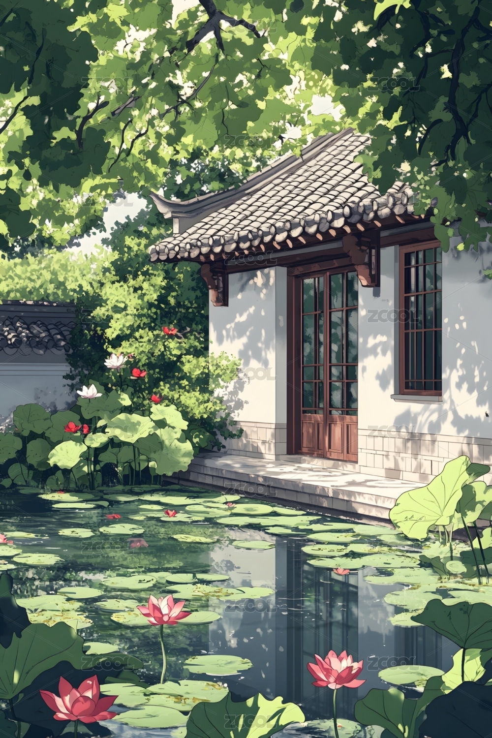 庭院,荷花,池塘,绿叶,日式,建筑,和风,自然,宁静