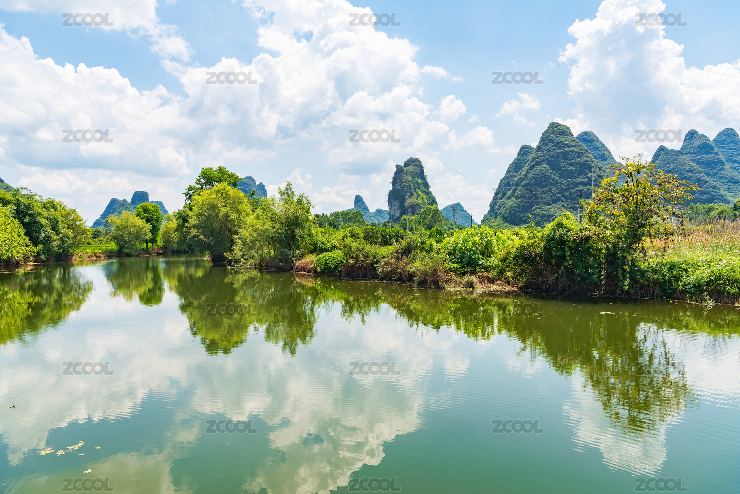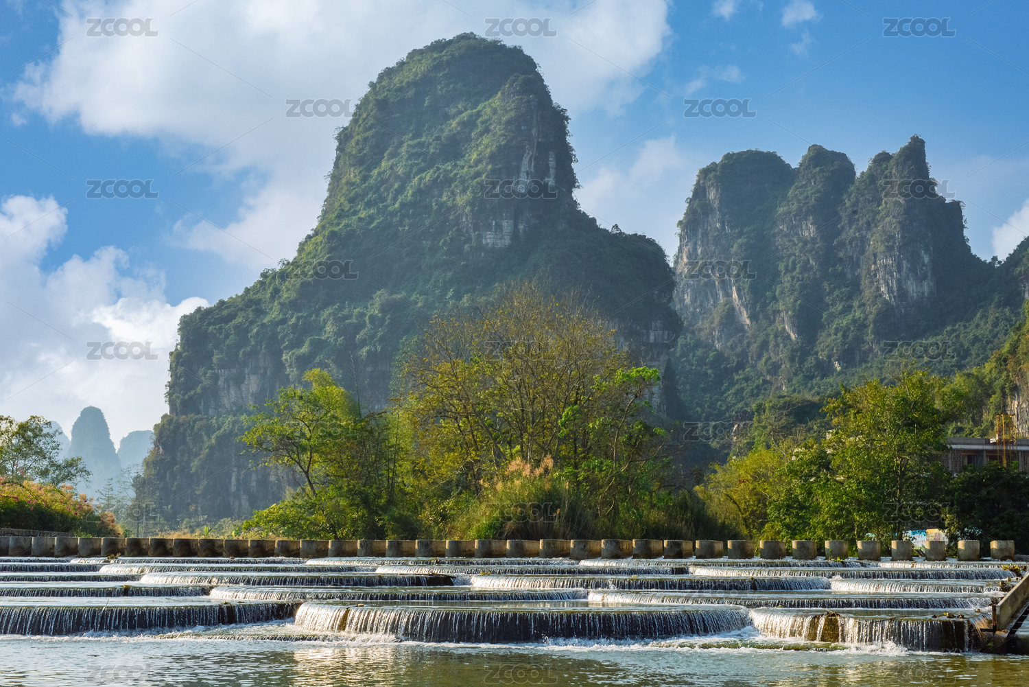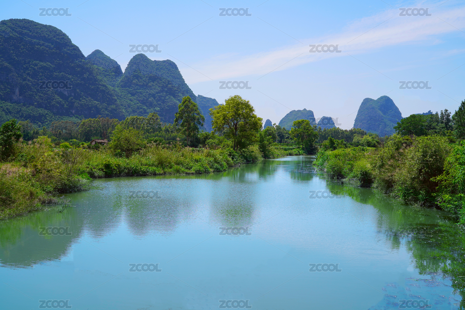 蓝天白云下阳朔遇龙河上两岸的田园风光