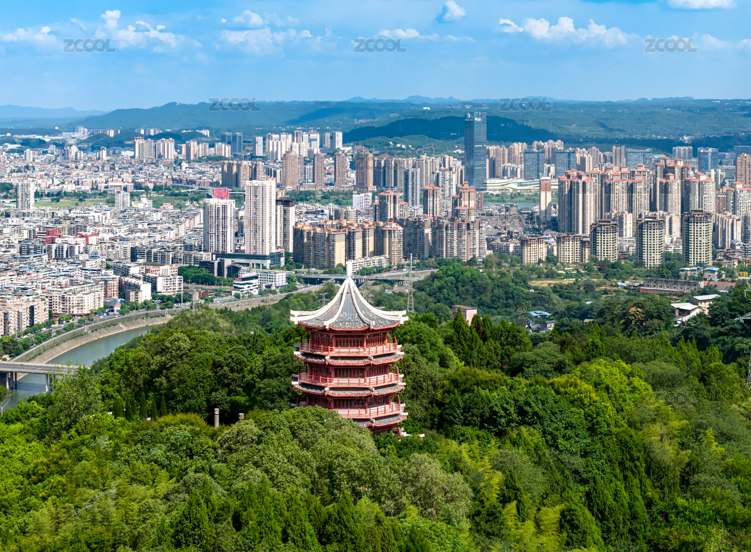 抱石公园古塔与林立的高楼