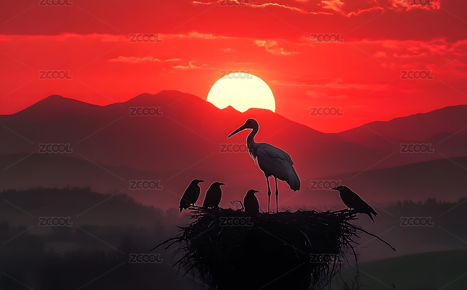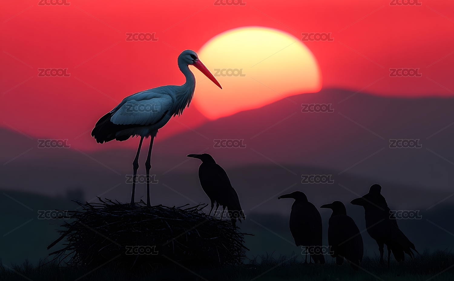 鹤,日落,剪影,草地,鸟类,自然,野生动物,黄昏,天空,云彩