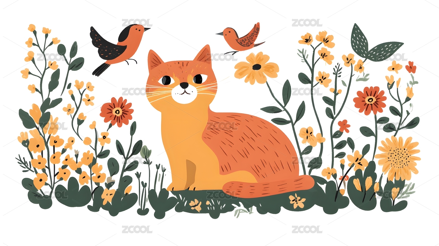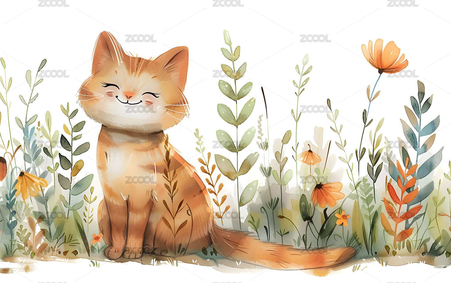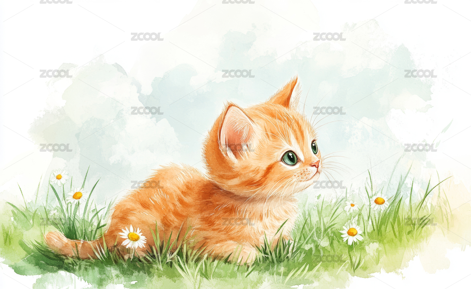 水彩画,插图,小猫,橙色,草地,白色花朵,大眼睛,可爱,动物,宠物