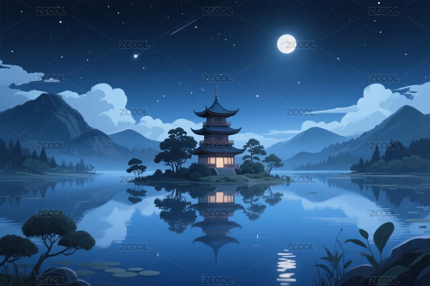 古塔山水夜景插画