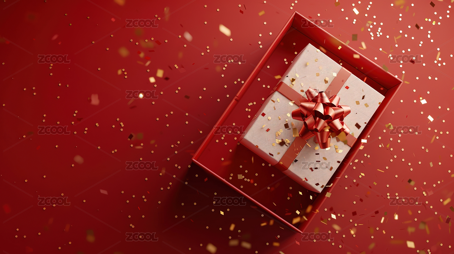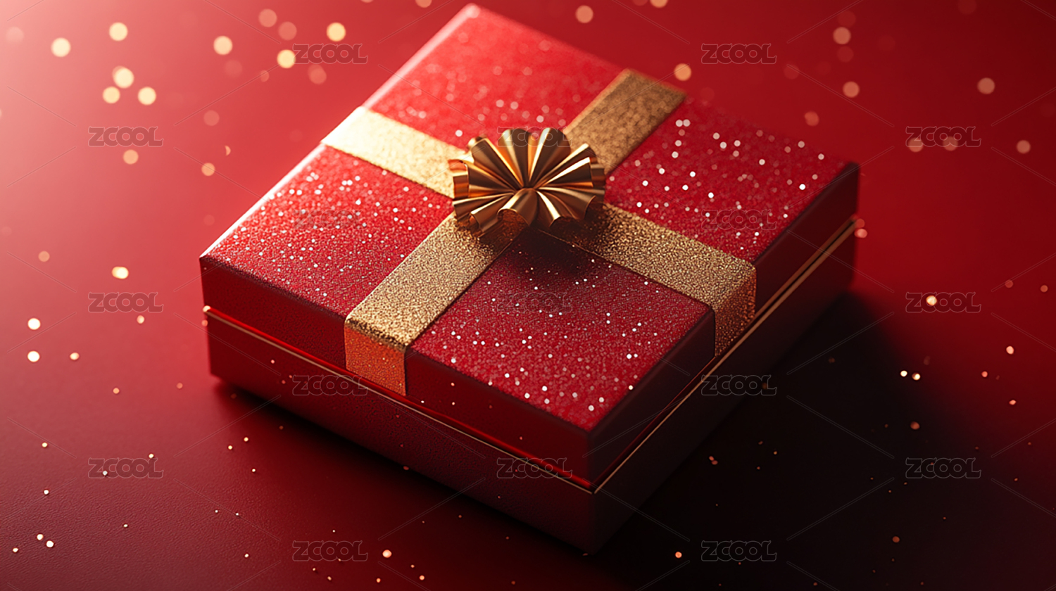 洒金红纸上放着一个金色系蝴蝶结的的礼盒