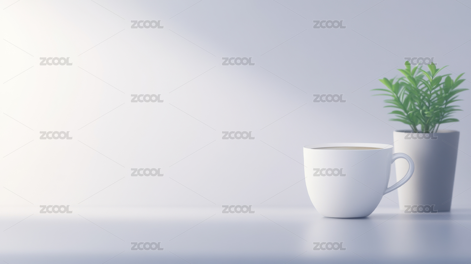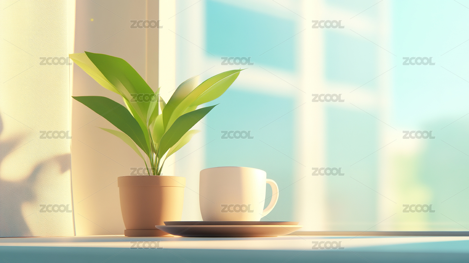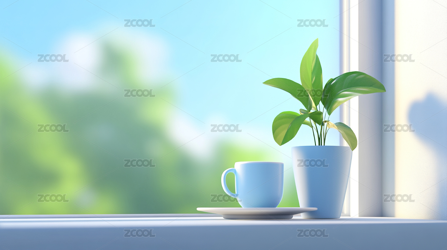 卡通,咖啡,叶子,杯子,植物,盆栽,窗户,雪山,清晨,阳光