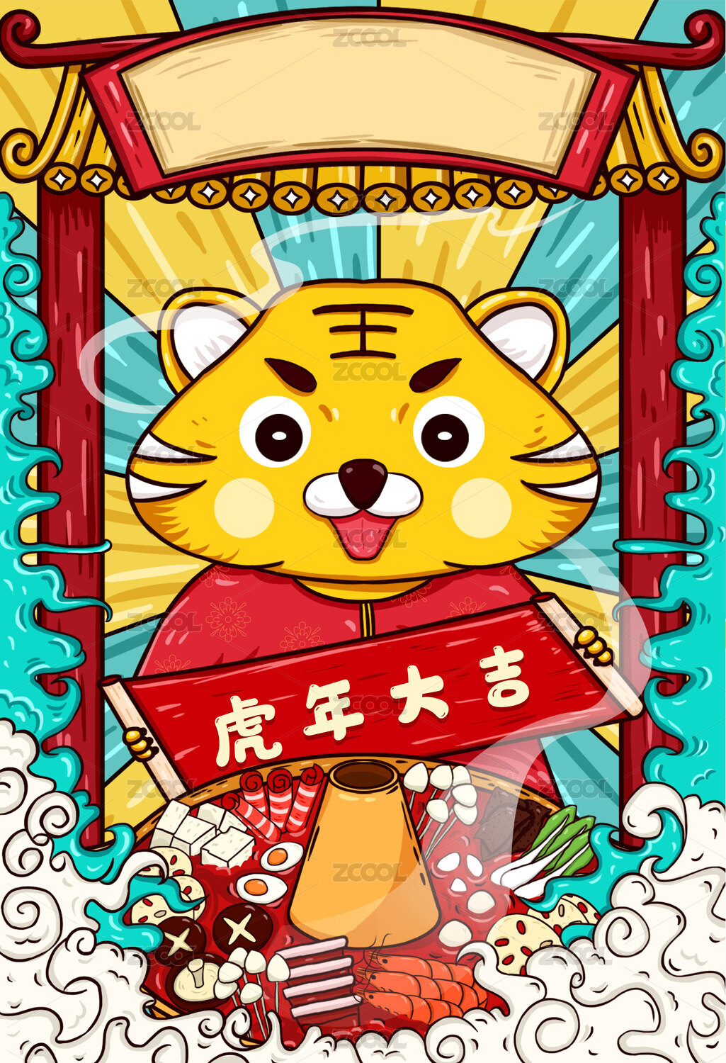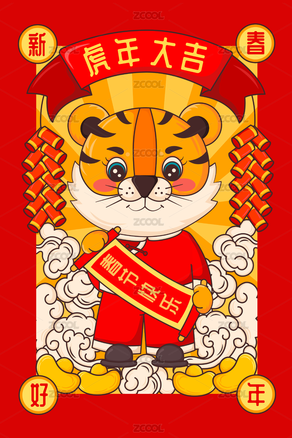 老虎,插画,新年,对联,元宝,祥云,红色,可爱,吉祥