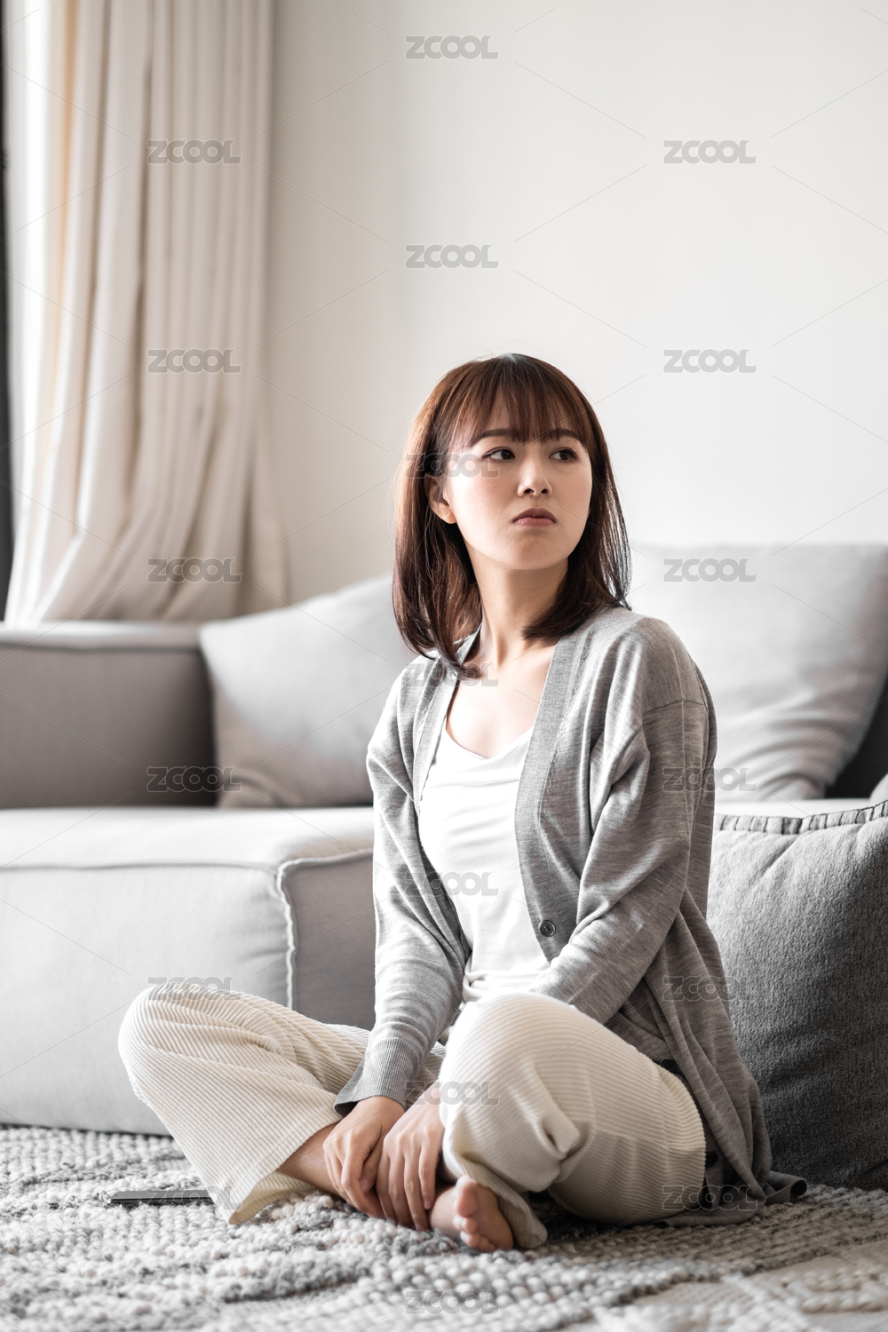 年轻的亚洲女生拿着手机靠在沙发上思考
