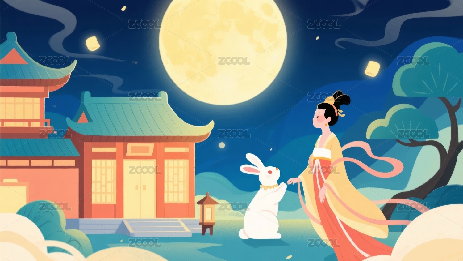 嫦娥抱着小白兔在月亮下看飞天的孔明灯