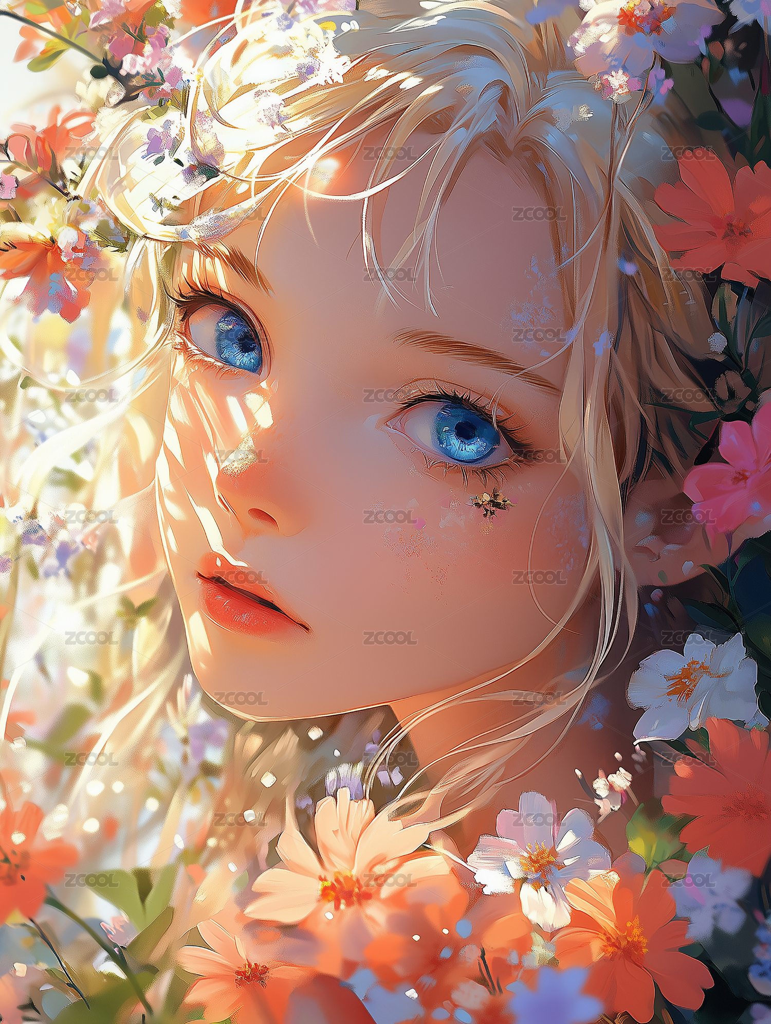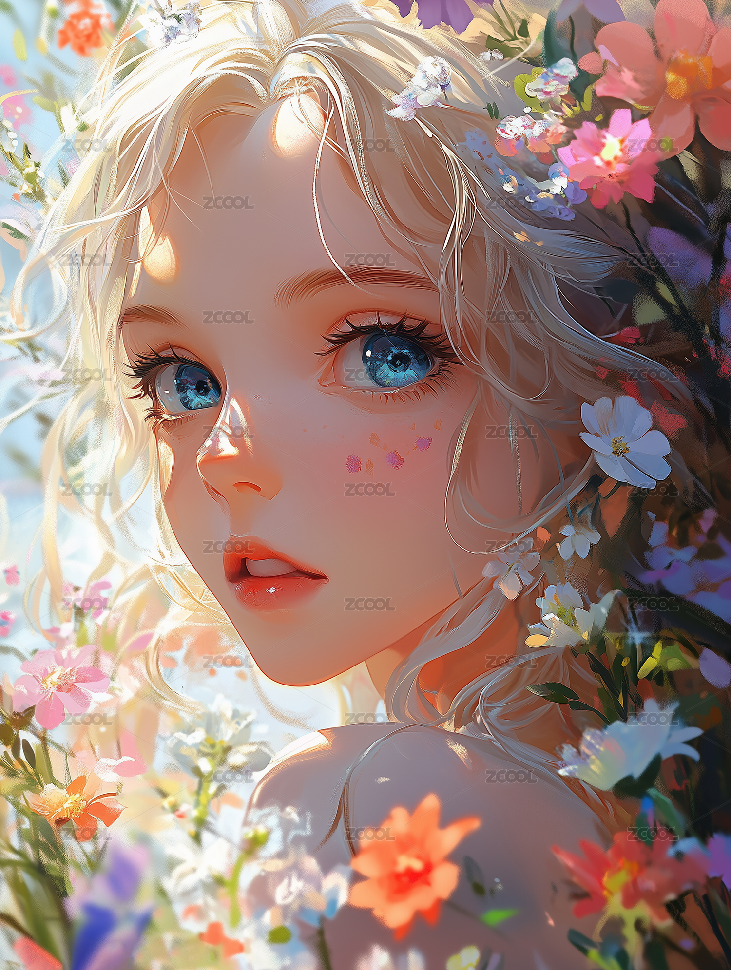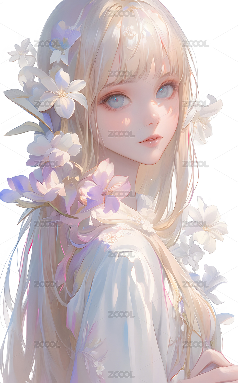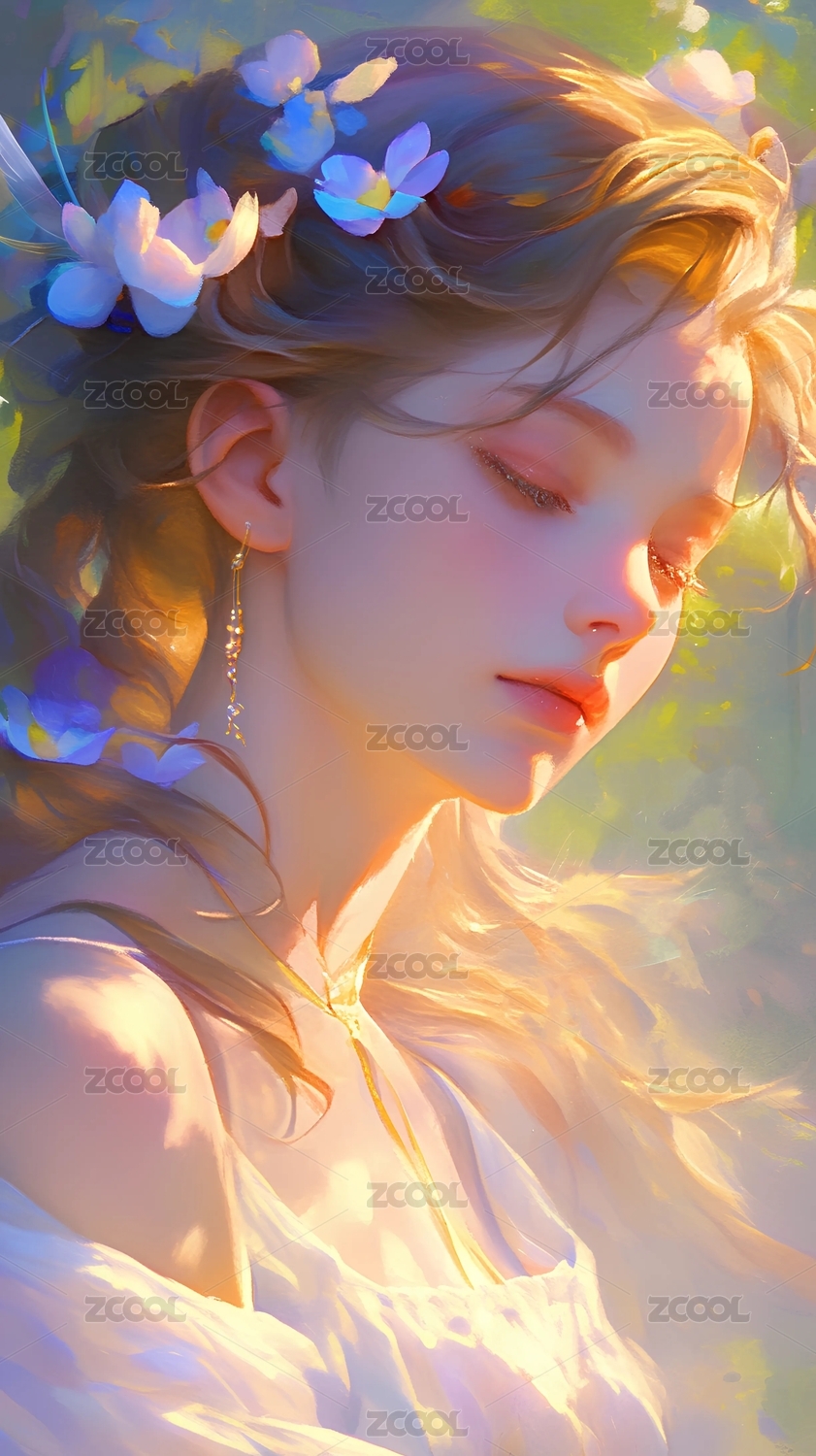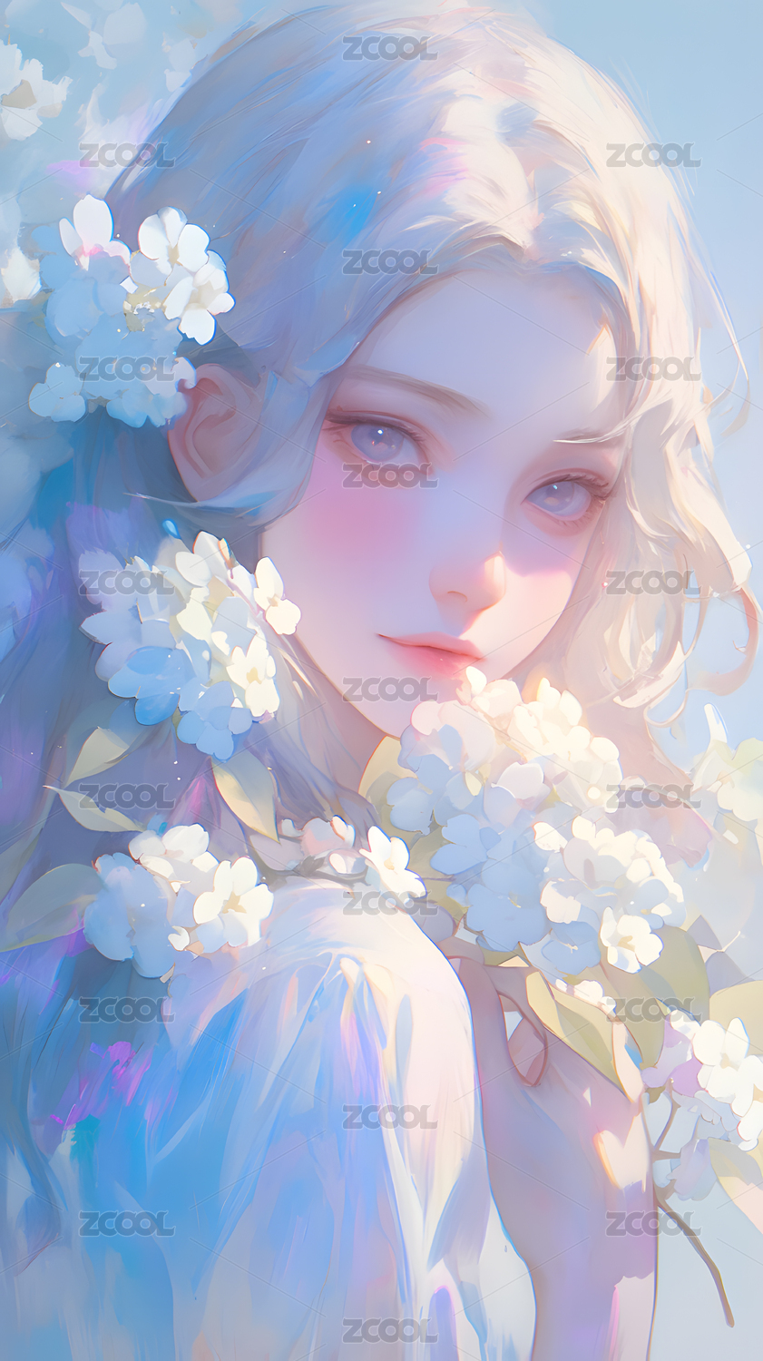 美女,花,治愈系,二次元,动漫,卡通,插画,人,女人,美