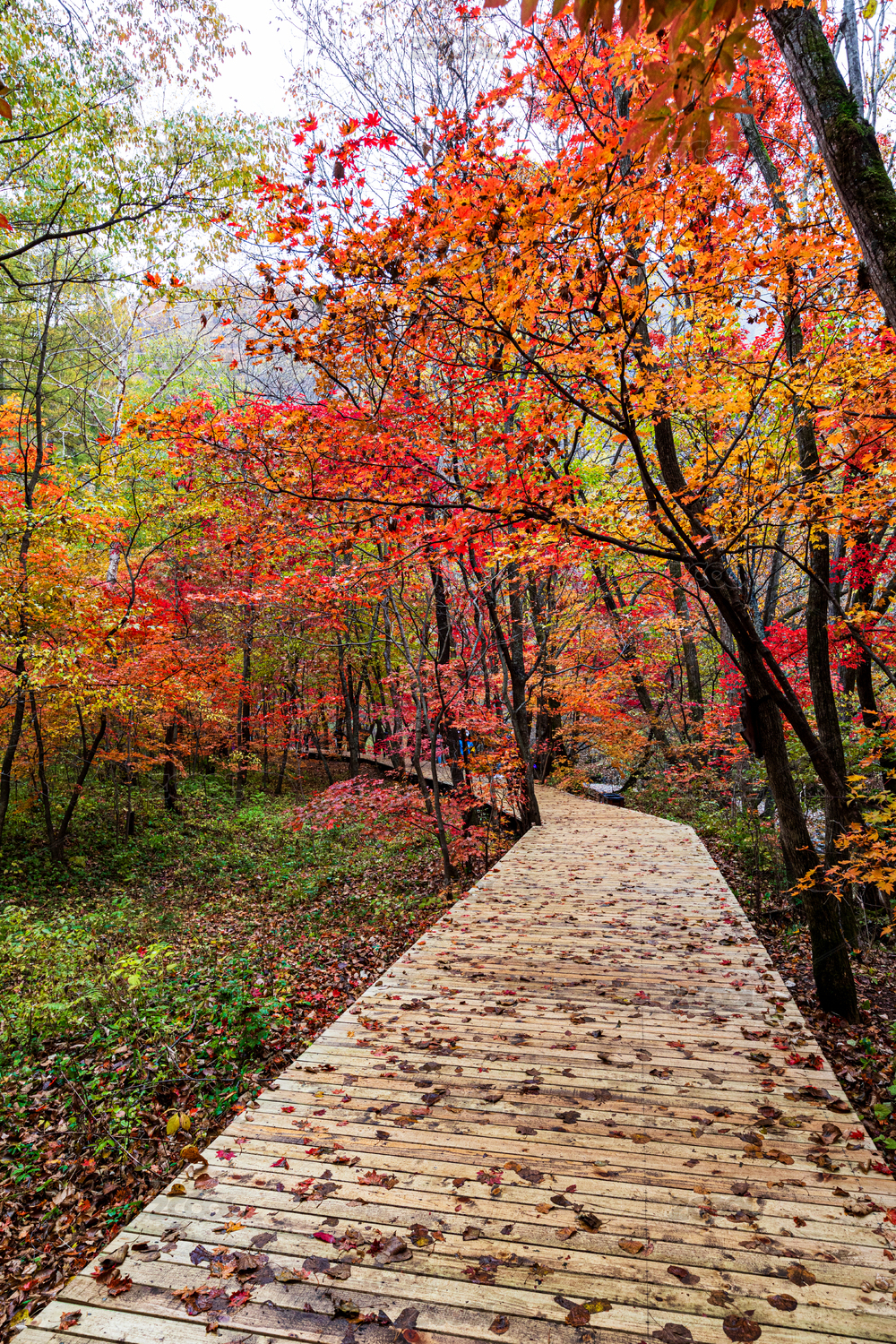 沈阳本溪老边沟,秋季多彩枫叶林间小路风光
