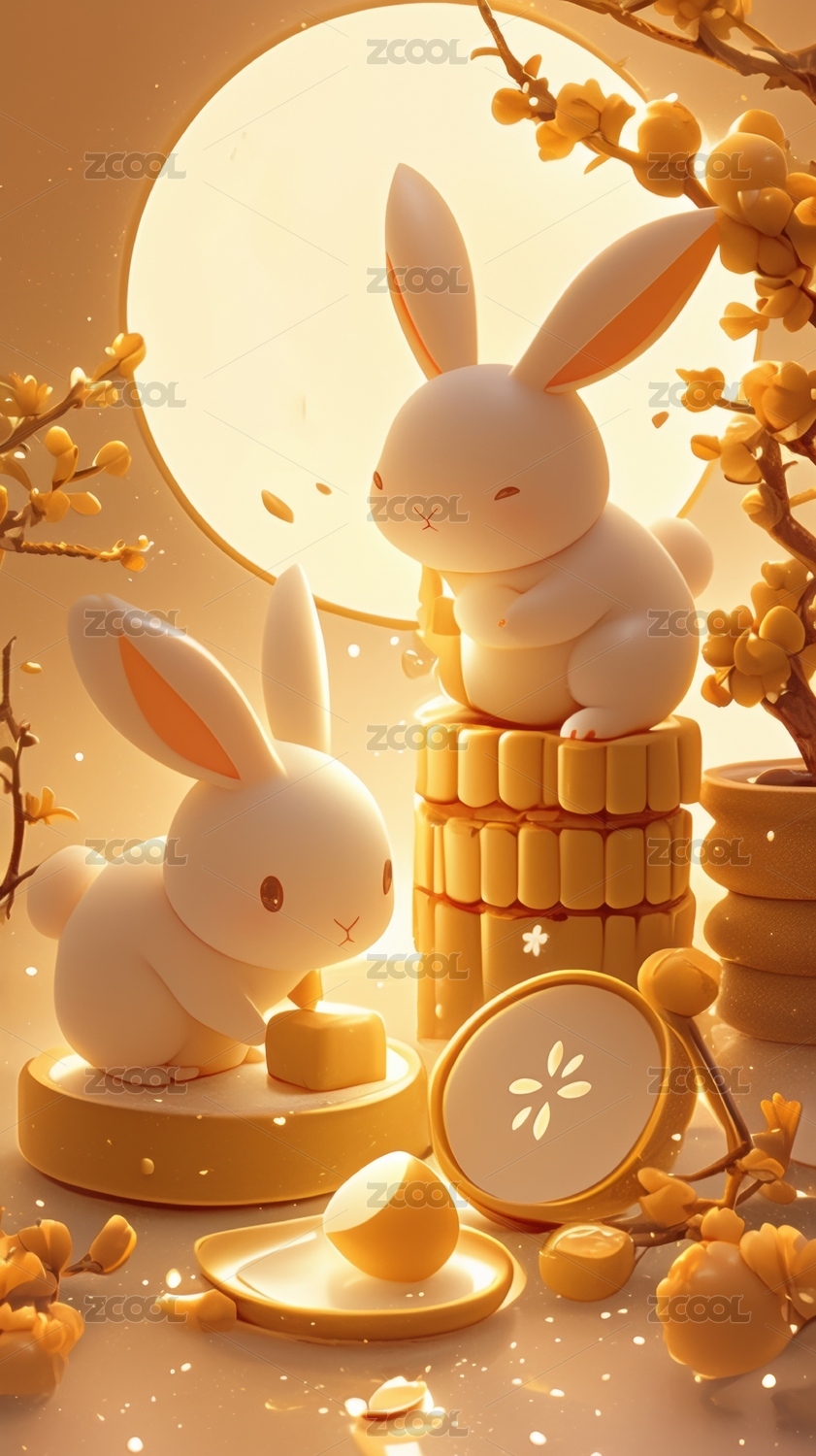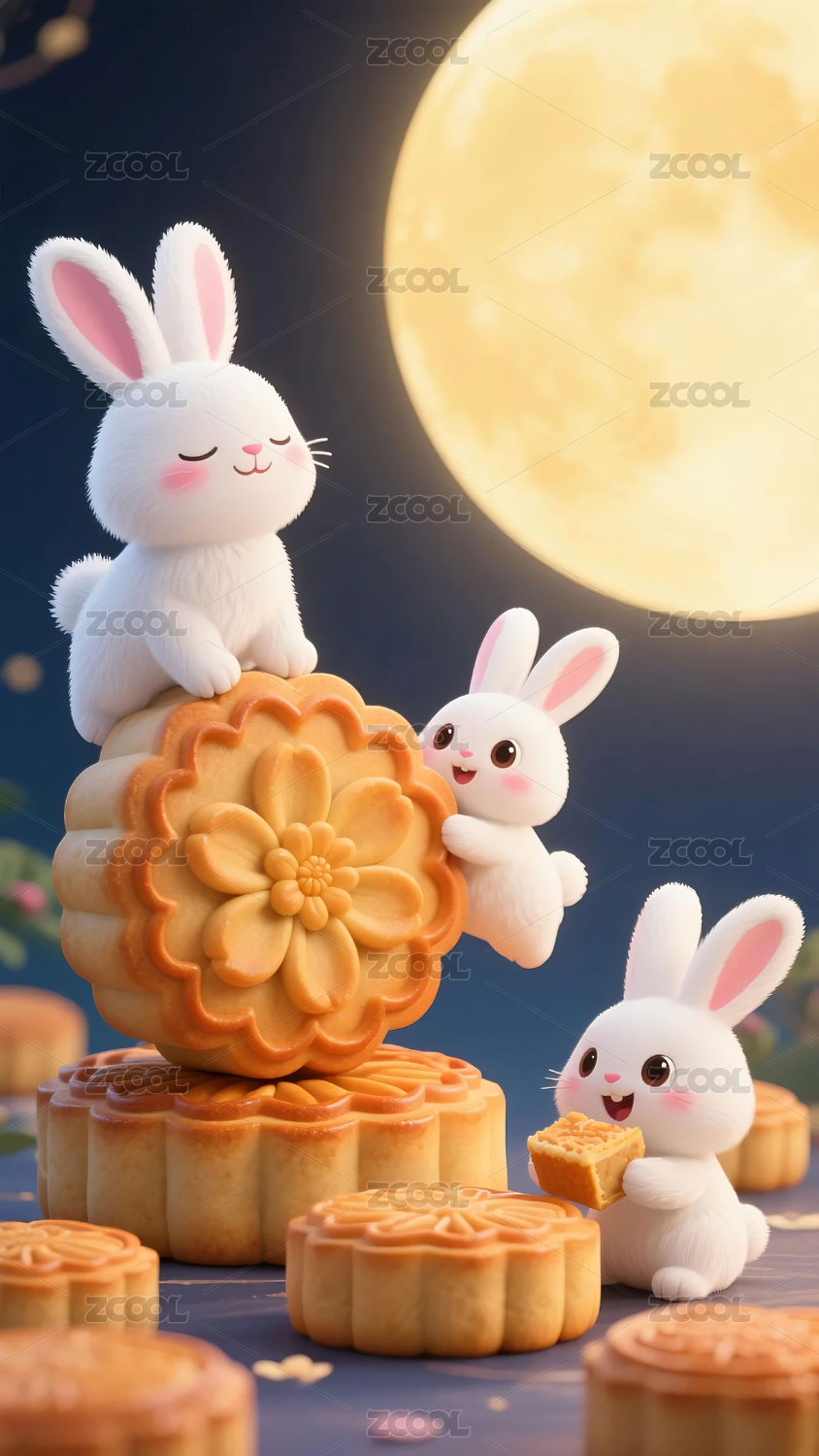 中秋节3D可爱小白兔和月饼在树下的场景