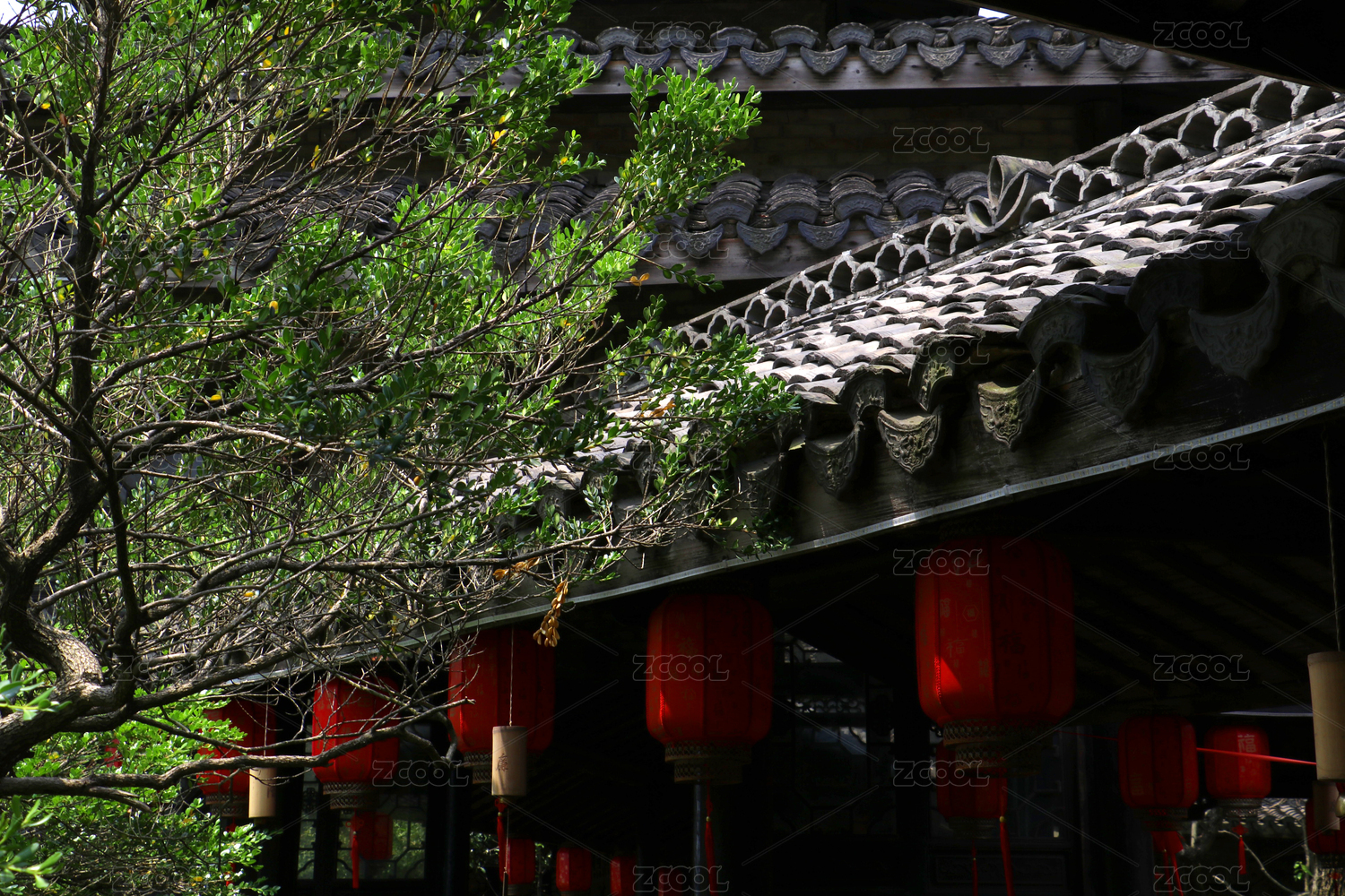 福建龙岩长汀县卧龙书院古朴庭院中的红灯笼