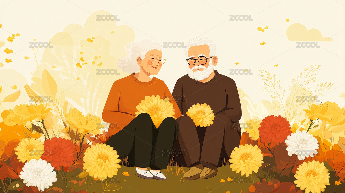 AIGC202406,重阳节,坐着,陪伴,老人,尊敬,花,黄色花,裤子,胡须