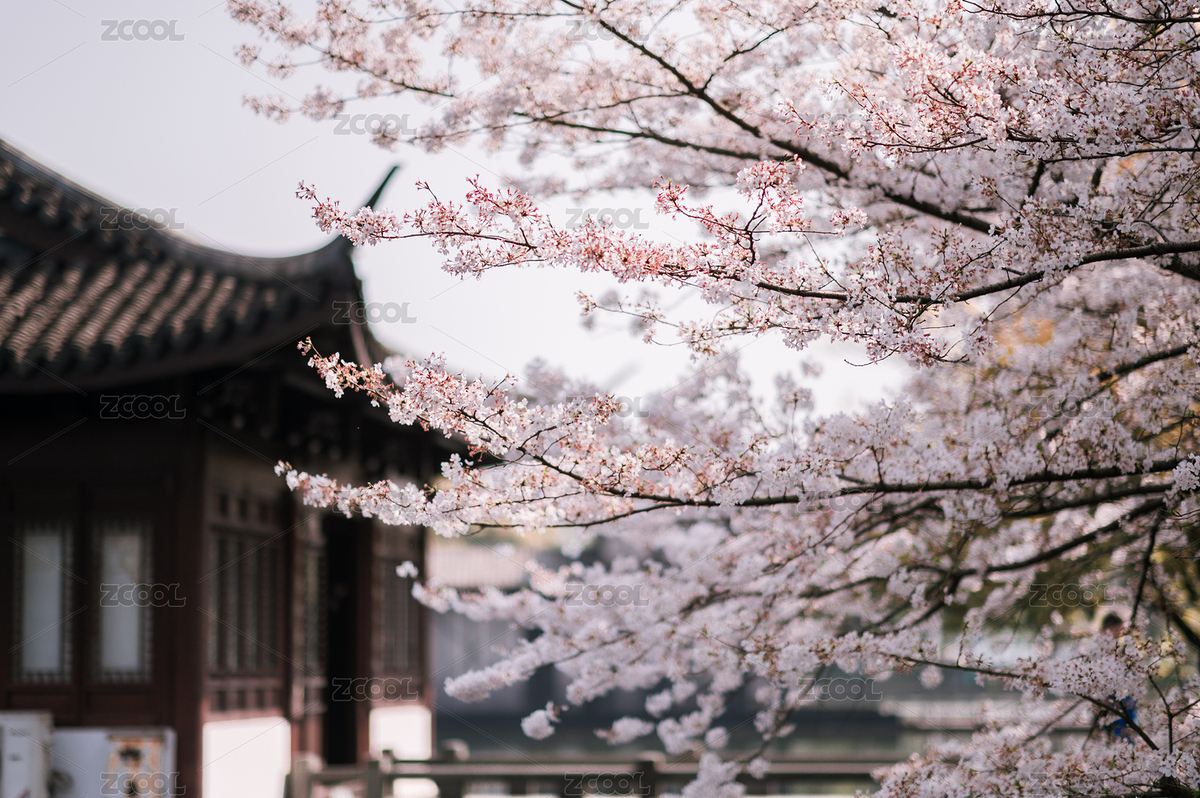 武汉堤角公园古建筑旁樱花