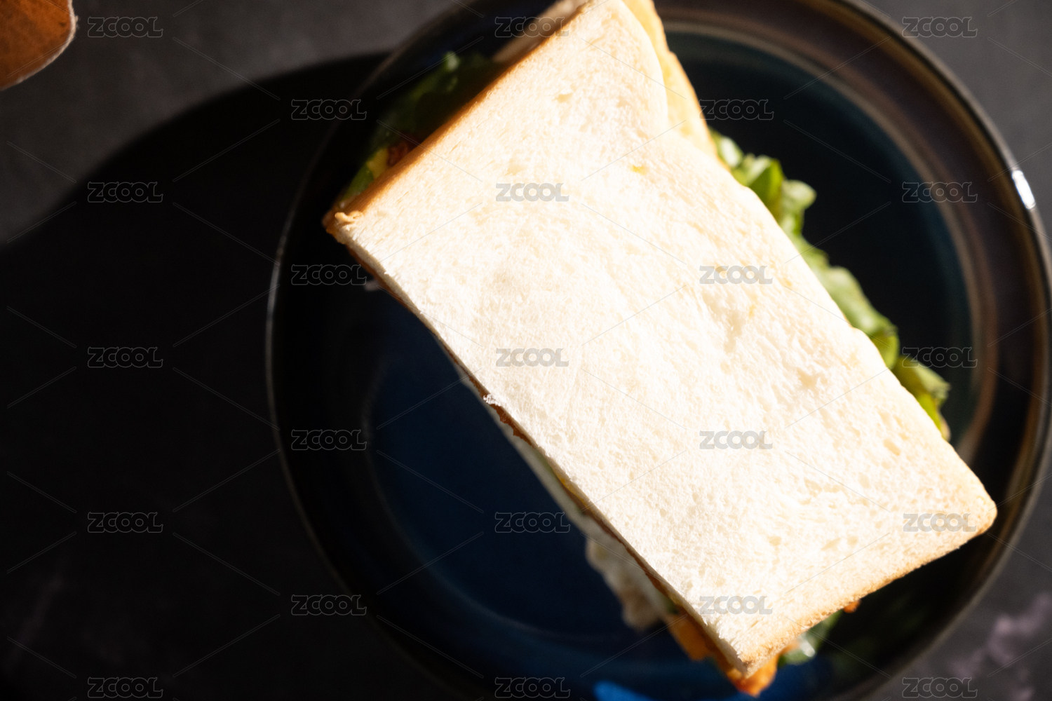 白底,俯视,白色桌面,投影,瓷碗,白碗,盘子,三明治,面包,切片