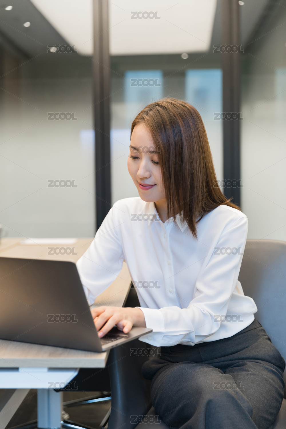 坐在沙发上使用笔记本电脑工作的职业女性形象