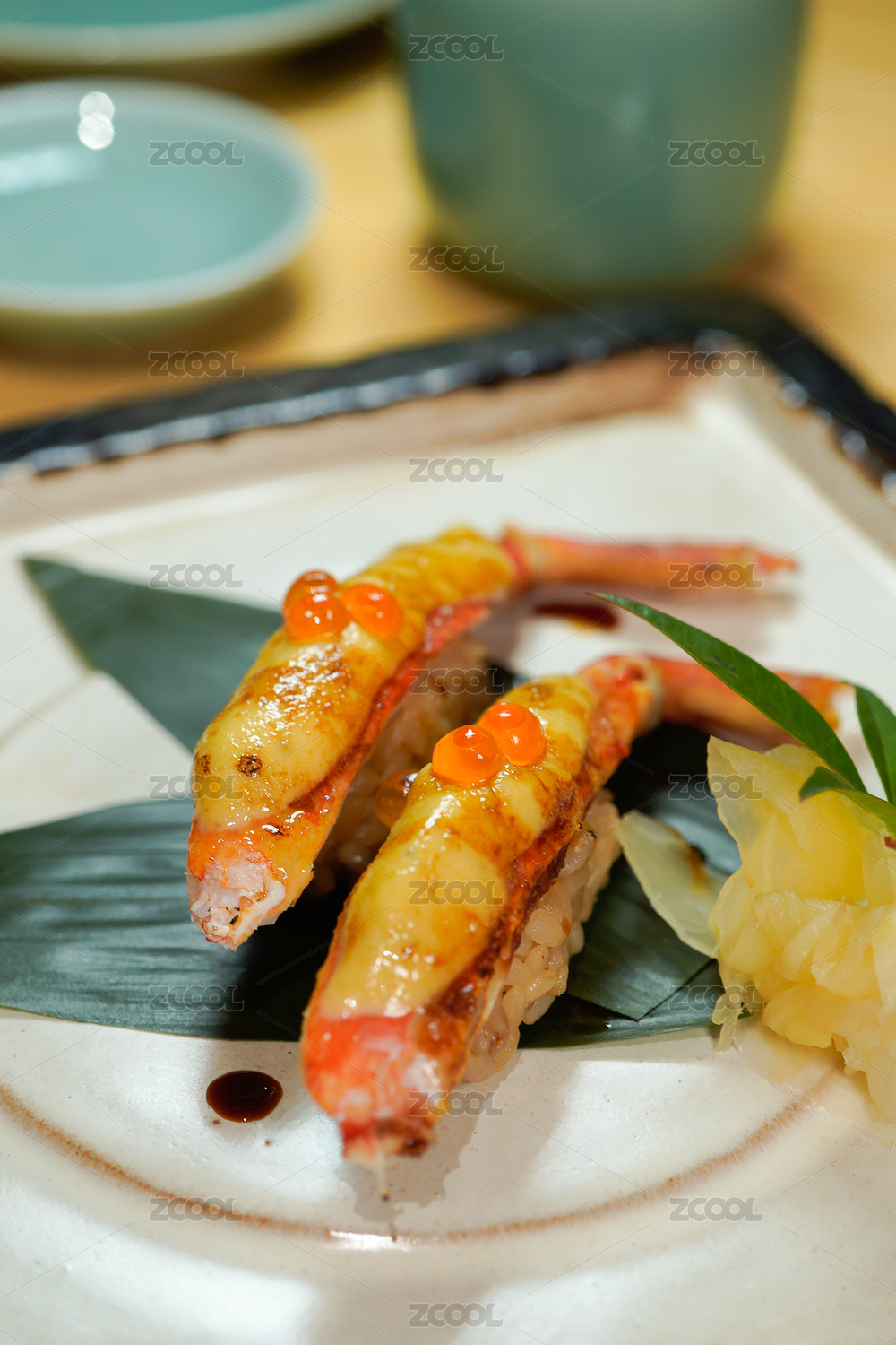 瓷盘装的2个虾寿司摆盘放在桌子上
