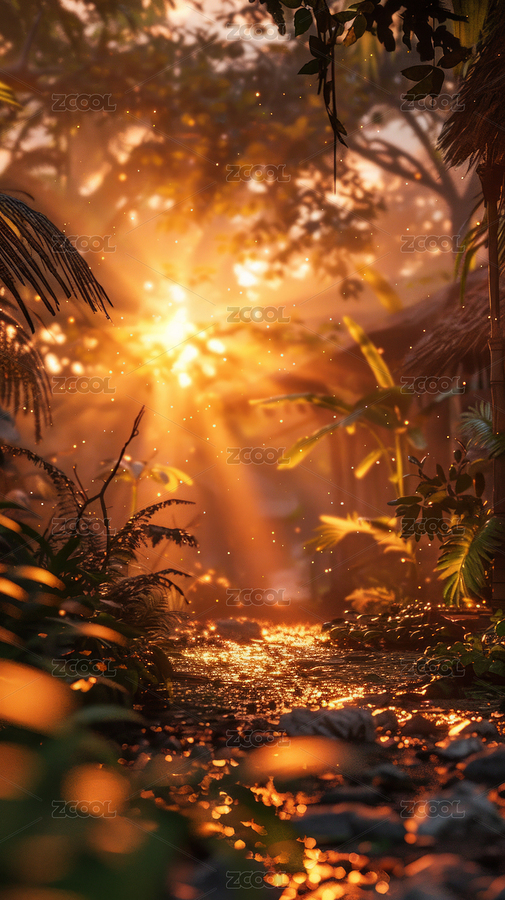 溪流旁的热带森林在阳光照耀下的宁静景象