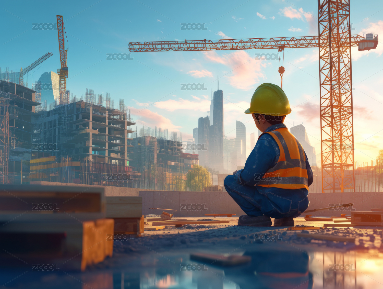 aigc,橙色,黄色,粒子,蓝色,建筑工地,工人,安全帽,建筑,起重机