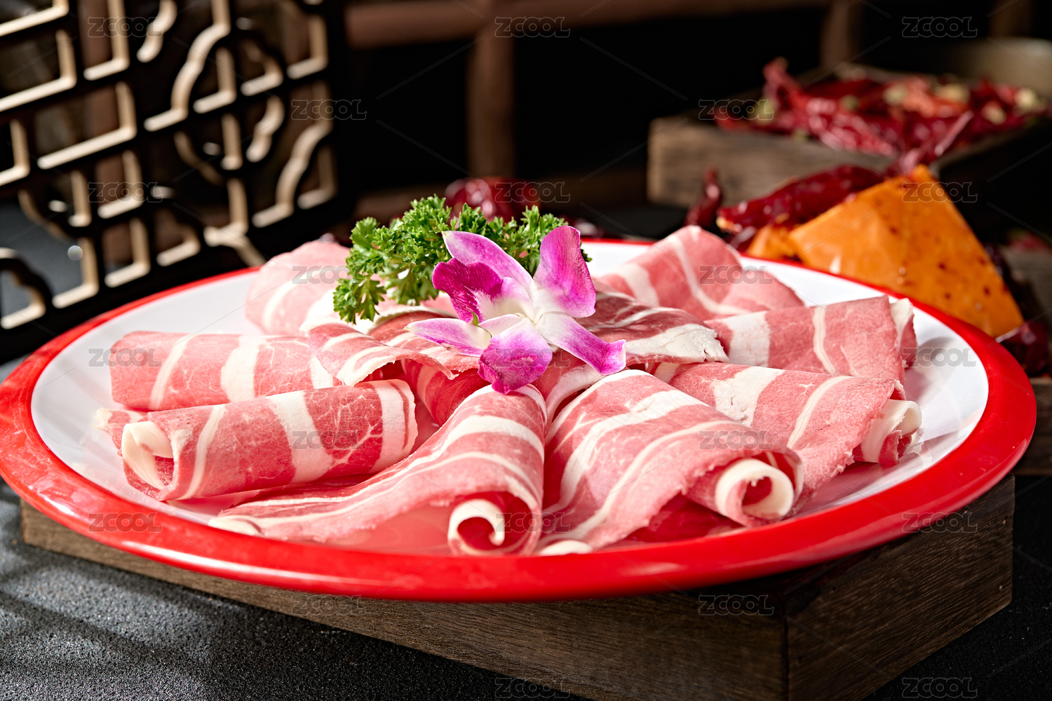 深色桌上盘里的重庆老火锅菜品牛肉片羊肉片