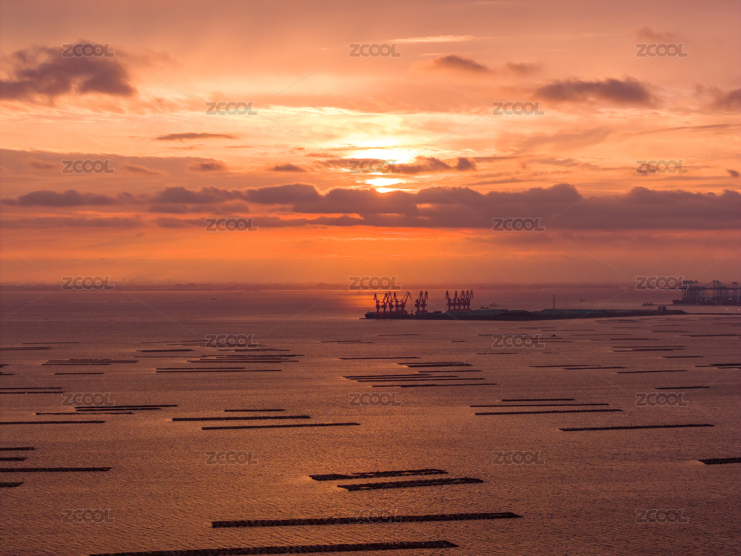 中国浙江嵊泗花鸟岛日落下的海上渔场航拍